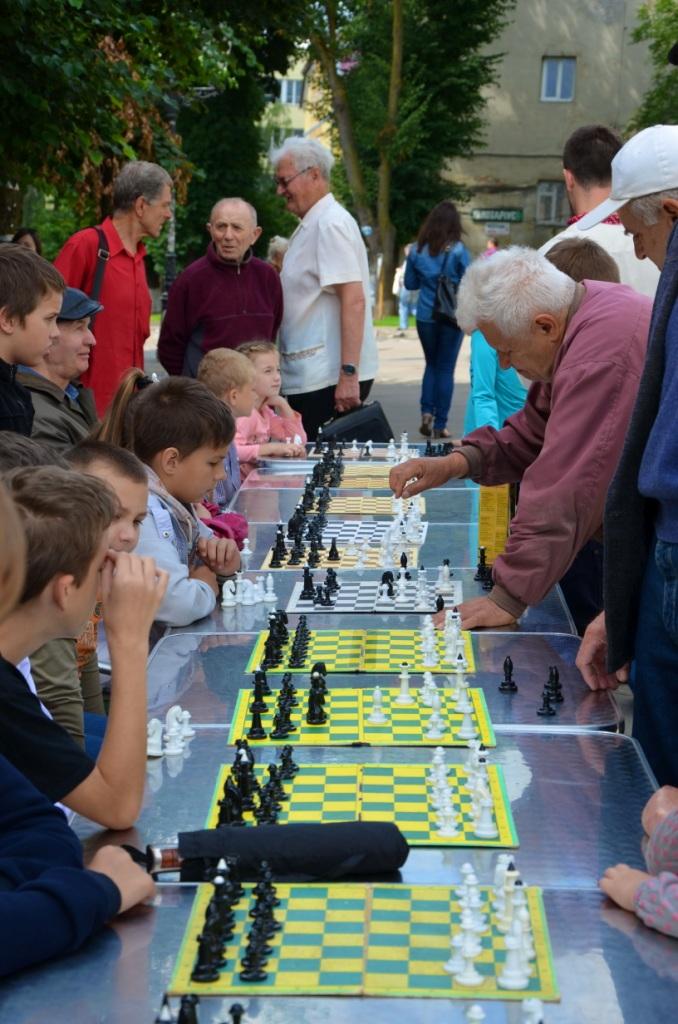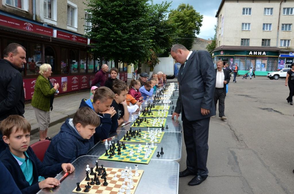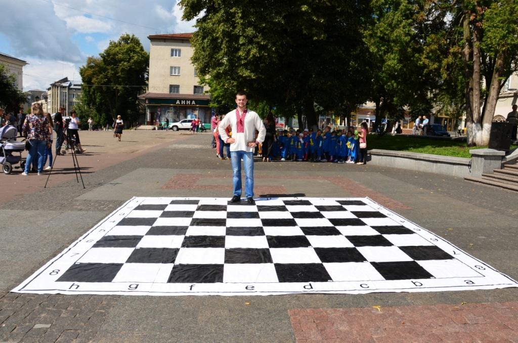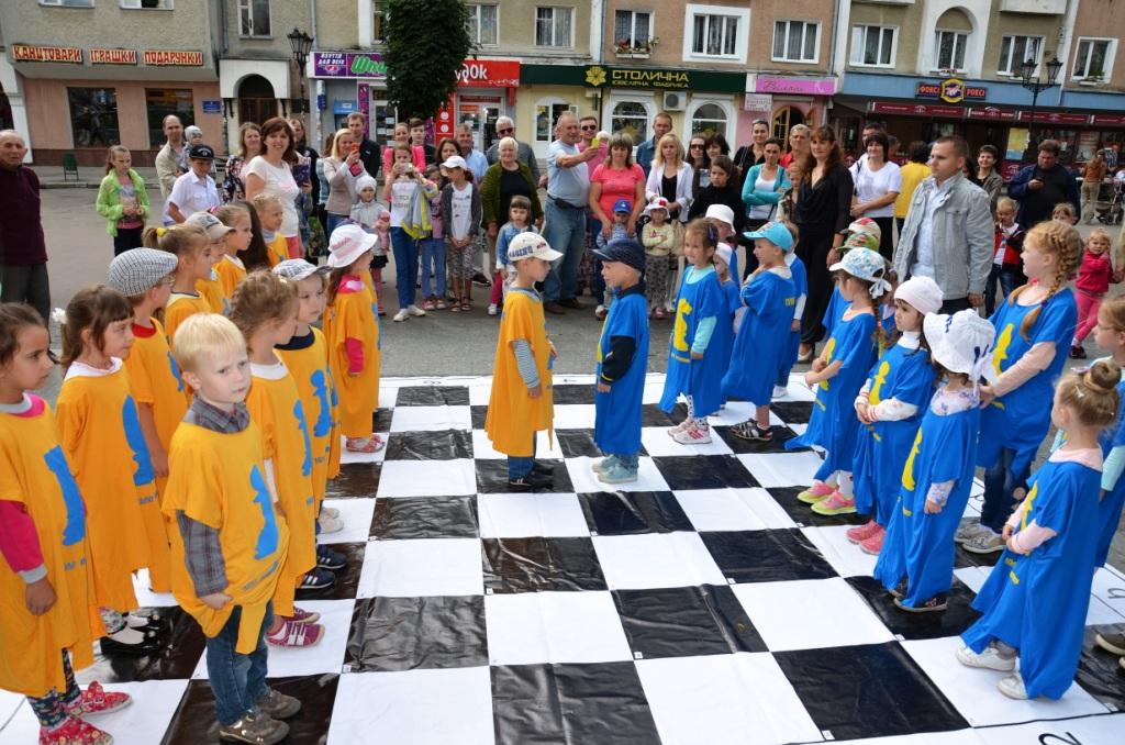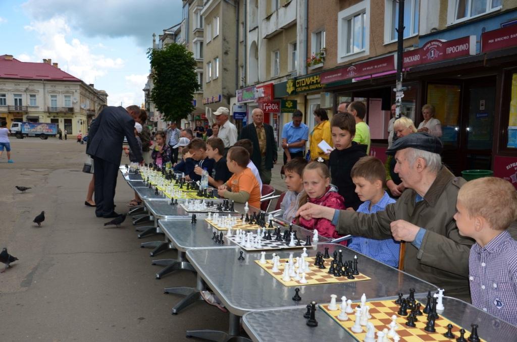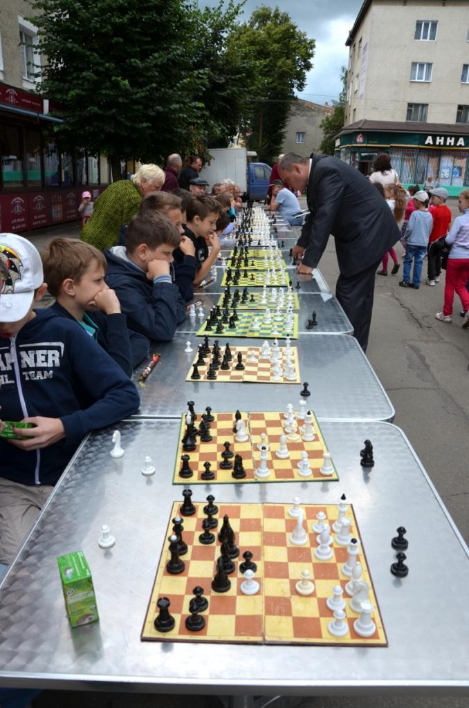 Захопливе видовище розпочалося 20 липня на площі Ринок у Дрогобичі. Зі святом Шахів привітали присутніх заступник Дрогобицького міського голови з гуманітарних питань Олег Дукас, майстер спорту України з шахів Святослав Попович та кандидат в майстри спорту України Іван Летнянка. З нагоди міжнародного Дня шахів на майдані Ринок відбулася театралізована вистава за участю маленьких дрогобичан та сеанс одночасної гри з майстром спорту України з шахів Святославом Поповичем (м. Львів). Спочатку у строкатих костюмах шахових фігур під марш композитора Майкла Камена вийшли вихованці дитсадка № 15 «Лелеченька». «Фігури вишикувалися, готові до бою… і ми розпочинаємо наш бій!» – урочисто оголосив ведучий заходу Іван Летнянка. За підтримки кандидатів в майстри спорту з шахів Олександра Соловйова та Володимира Кузика ступали на оголошене місце шахової «дошки» живі фігури: пішаки, коні, ферзь, король… Ходи шахових фігур, які оголошував з мікрофона Іван Летнянка, відображав на дерев’яній дошці член Клубу Назар Зрайло. За всім спостерігали глядачі. Цікаво, що партія, яку представили діти на виставі «живих шахів», зіграна у 1857 році американським шахістом, уродженцем Франції Наполеоном Мараше і геніальним американським шахістом Полом Морфі. Пол Морфі, до речі, вважається першим шаховим вундеркіндом після створення сучасних правил шахів. Навколо цього видовища збиралися батьки дітей, вихователі дитсадка та перехожі. Маленькі артисти в образі шахових фігур розіграли блискучу гру, впродовж якої за 20 ходів було поставлено мат королю. Після такої вистави Іван Летнянка розповів захопливу історію про зародження шахів, їх роль у науці та житті тощо. Після цього епіцентр подій перемістився на тимчасовий шаховий майданчик біля стін кав’ярні «Фоксі-Роксі», де розпочався сеанс одночасної гри зі Святославом Поповичем. У цьому турнірі взяли участь як юні шанувальники інтелектуального виду спорту, так і дрогобичани літнього віку.