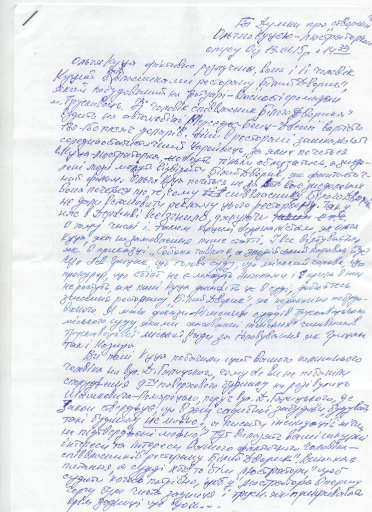 Так, у нас в державі все зігнило, дякуючи в тому числі і таким куцим журналісткам як Ольга Куца, яка на замовлення пише статті. І все відбувається як в приказці «Собака гавкає, а злодійський караван йде». Що Лев Грицак, що голова суду, що міський голова, що прокурор, що есбіст не є, мабуть, ангелами і крила в них не ростуть, але, пані Куца, докажіть це в суді, добийтеся знесення ресторану «Білий Дворик» як незаконно побудованого. Я маю докази – рішення суддів Трускавецького міського суду, якими скасовані рішення чиновників Трускавецької міської ради за головування як Грицака, так і Козира.