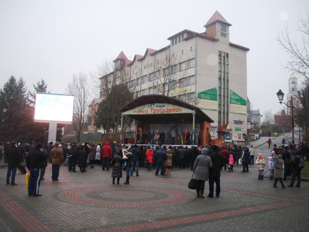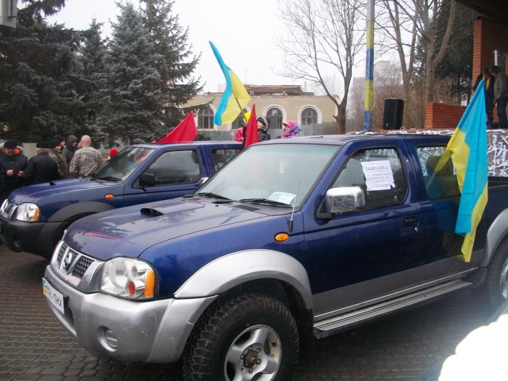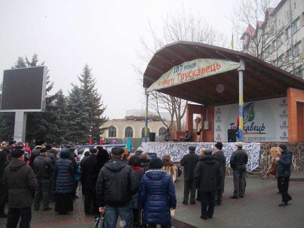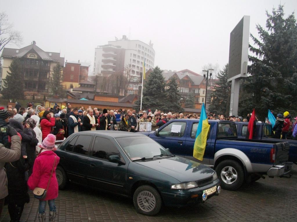 Передача автомобілів у зону АТО планувалася як віче. Можна було пригадати події річної давнини, коли 1, 8, 15 грудня центральна площа Трускавця не могла вмістити всіх бажаючих – такий був зрив народу в нашому місті-курорті. На жаль, чи то похмура погода та слизька дорога завадили, чи розчарування (або ще гірше, байдужість) трускавчан, але на захід передання автомобілів прибуло дуже мало людей – від півсотні до сотні, включаючи відпочивальників. Та від цього світлий та піднесений настрій присутніх, підкріплений вірою у нашу правоту та перемогу, не погіршився.