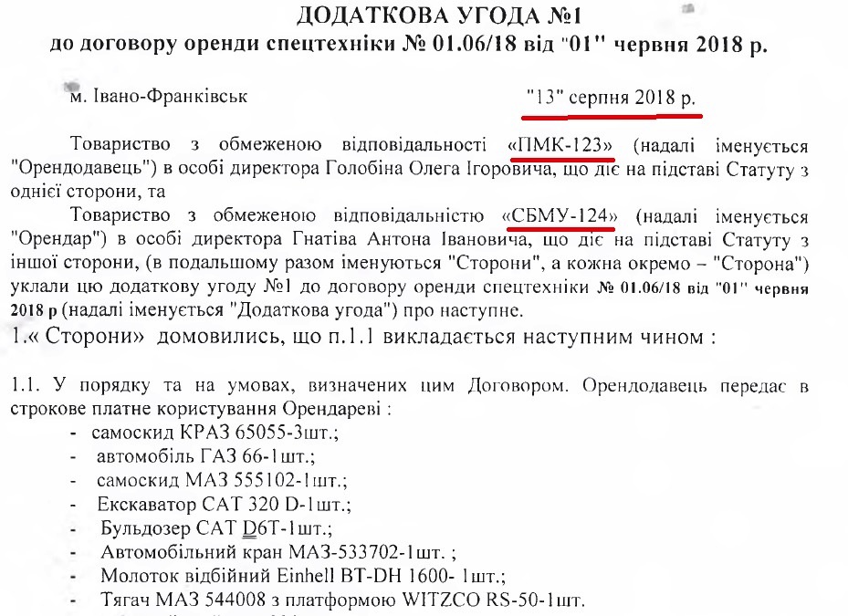 Для ТОВ «СБМУ-124» це перша перемога на торгах. Згідно з довідкою про матеріально-технічну базу, всю техніку (18 одиниць) фірма орендує у ТОВ «ПМК-123».