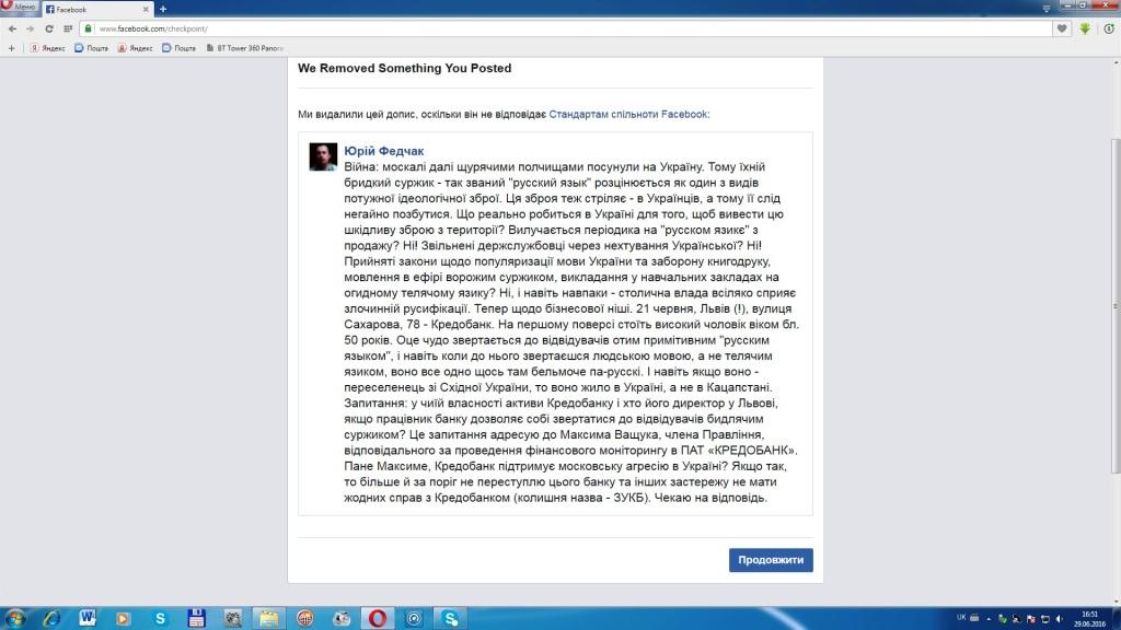 До речі, пропоную прочитати, за що. У ньому я висловив свою особисту думку. Цікаво, то так українофоби перелякались правди про нікчемність телячого язика московитів чи це – така реакція Кредобанку, відповіді від якого на відкрите звернення я так і не отримав? Що б там не було, але таку політику Фейсбуку розцінюю як переслідування свободи слова і утиски за мовними ознаками, сприяння військовій пропаганді Кремля, що призводить до дискредитації Facebook в очах світової спільноти. Чи потрібен нам Facebook, якщо його адміністрація сприяє московським тролям та пропаганді війни, а навігація на сайті в частині Довідкового центру Українською мовою недоступна? Користувачеві натомість пропонують так звану “російську” мову чи хоч суомі, але не Українську. Значить, компанія Facebook не зацікавлена у розвитку та захисті Українського сегменту користувачів.