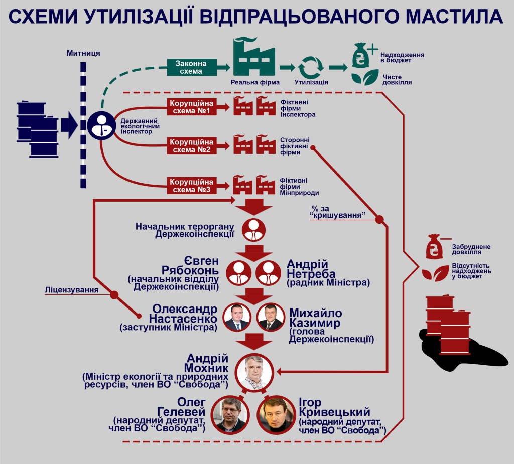 У лютому цього року в Мінприроди відбулася зміна керівництва. Місце Олега Проскурякова посів висуванець партії «Свобода» Андрій Мохник. В принципі, на цьому радикальні зміни у відомстві закінчились. А корупція не просто залишилась, а забуяла ще ряснішим цвітом. Зокрема, за час керування Андрія Мохника загрозливих масштабів набула схема з розкрадання й відмивання коштів, сплачених імпортерами мастил (олив) на збирання, видалення, знешкодження й утилізацію цих товарів. Схема, хоч і нескладна, але потребує окремого роз’яснення.