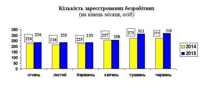 Середньооблікова кількість безробітних, які отримували допомогу по безробіттю із Фонду загальнообов’язкового державного соціального страхування на випадок безробіття впродовж червня 2015 року становила 264 особи. Середній розмір допомоги по безробіттю в розрахунку на одного безробітного впродовж червня становив 1037,12 грн., що дорівнює 85,1% законодавчо визначеного розміру мінімальної заробітної плати (1218,00 грн.).
