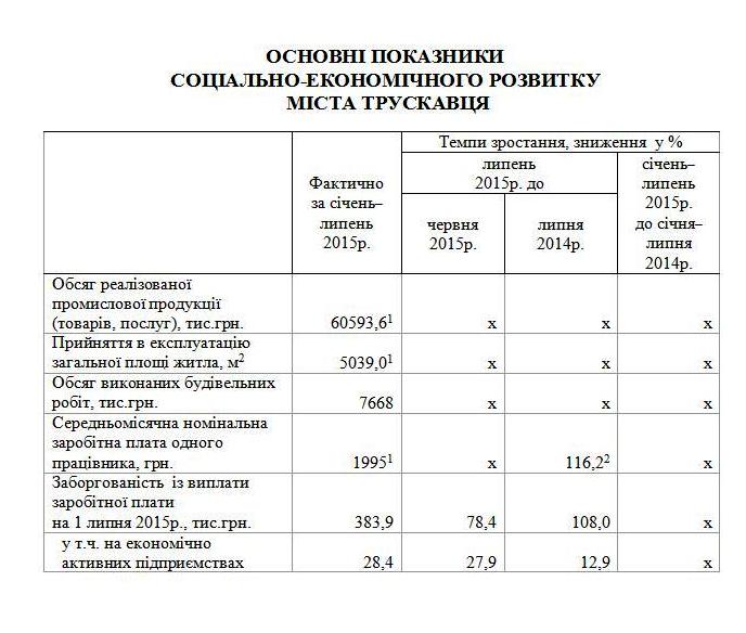 Середньомісячна номінальна заробітна плата одного штатного працівника підприємств, установ та організацій (далі підприємств) у місті Трускавці у січні – червні 2015 року становила 1994,63 грн., і у 1,6 рази перевищила рівень встановленої мінімальної заробітної плати та розмір прожиткового мінімуму для працездатних осіб (1218,00 грн.) та порівняно з січнем-червнем 2014р. збільшилась на 16,2%. Також її рівень на 40,2% менше середнього рівня в економіці області, та на 45,3% менше, ніж в Бориславі, і на 25,6% менше, ніж в Дрогобичі.
