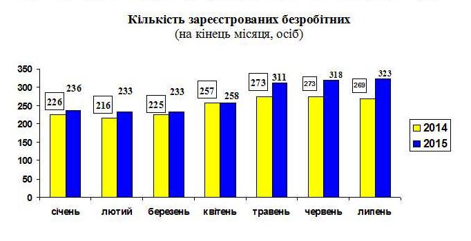 Кількість зареєстрованих безробітних у місті на кінець липня 2015р. становила 323 особи, з них 176 осіб (54,5%) – жінки та 129 особи (39,9%) – молодь у віці до 35 років. Допомогу по безробіттю отримували 285 осіб (88,2%), які мали статус безробітного.