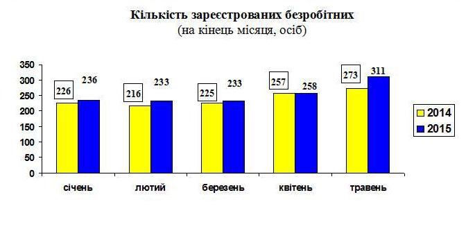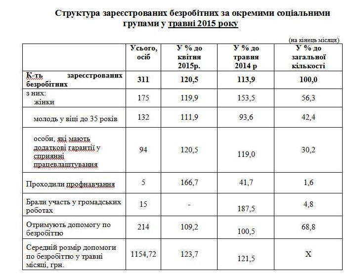 Середньооблікова кількість безробітних, які отримували допомогу по безробіттю із Фонду загальнообов’язкового державного соціального страхування на випадок безробіття впродовж травня 2015 року становила 212 осіб. Середній розмір допомоги по безробіттю в розрахунку на одного безробітного впродовж травня становив 1154,72 грн., що дорівнює 94,8% законодавчо визначеного розміру мінімальної заробітної плати (1218,00 грн.).