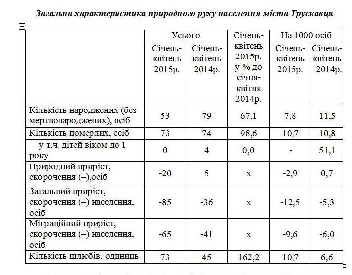 Упродовж січня-квітня 2015р. у місті Трускавці народилися 53 дитини, померло 73 особи.