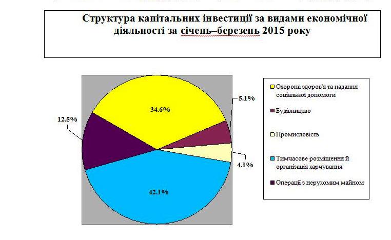 За видами економічної діяльності найбільше інвестицій в місті освоєно тимчасовим розміщенням й організаціями харчування – 7,3 млн. грн. (42,1% від загального обсягу капітальних інвестицій по місту), закладами охорони здоров’я та надання соціальної допомоги – 6,0 млн. грн. (34,6%) та операції з нерухомим майном – 2,2 млн. грн. (12,5%). Найменше освоєно інвестицій будівництвом – 893,0 тис. грн. (5,1%) та промисловістю – 719,0 тис. грн. (4,1%).