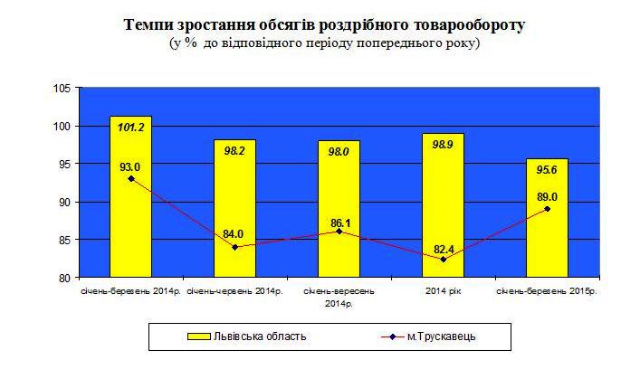 Загальний обсяг роздрібного товарообороту підприємств (юридичних осіб), що здійснюють діяльність з роздрібної торгівлі у місті Трускавці за січень-березень 2015 року становив 73,8 млн. грн. та зменшився проти січня-березня 2014р. за порівняльними цінами на 9,2%.