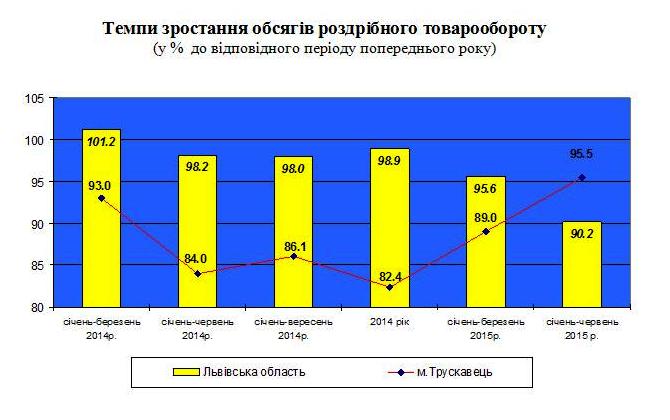 Загальний обсяг роздрібного товарообороту підприємств (юридичних осіб), що здійснюють діяльність з роздрібної торгівлі у місті Трускавці за січень-червень 2015 року становив 158,8 млн.грн та зменшився проти січня-червеня 2014р. за порівняльними цінами на 4,5%.