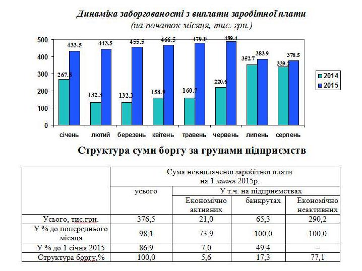 Сума невиплаченої заробітної плати станом на 1 серпня 2015р. працівникам підприємств-банкрутів становить 65,3 тис. грн. Частка боргу до підсумку становить 0,2% по області.