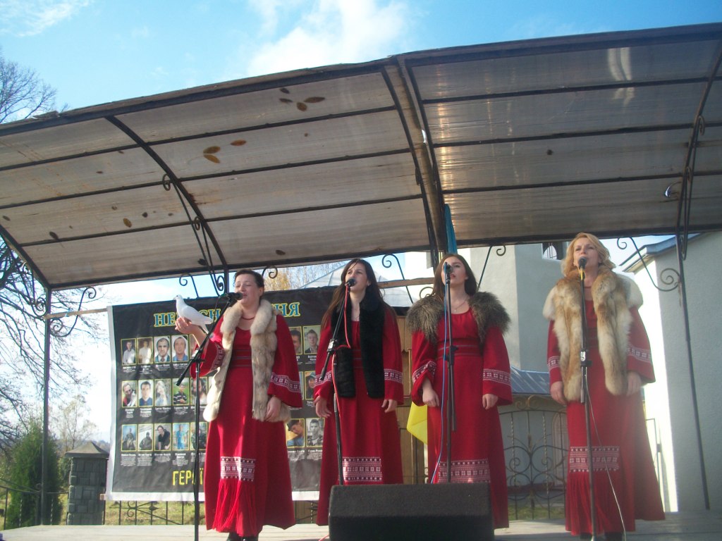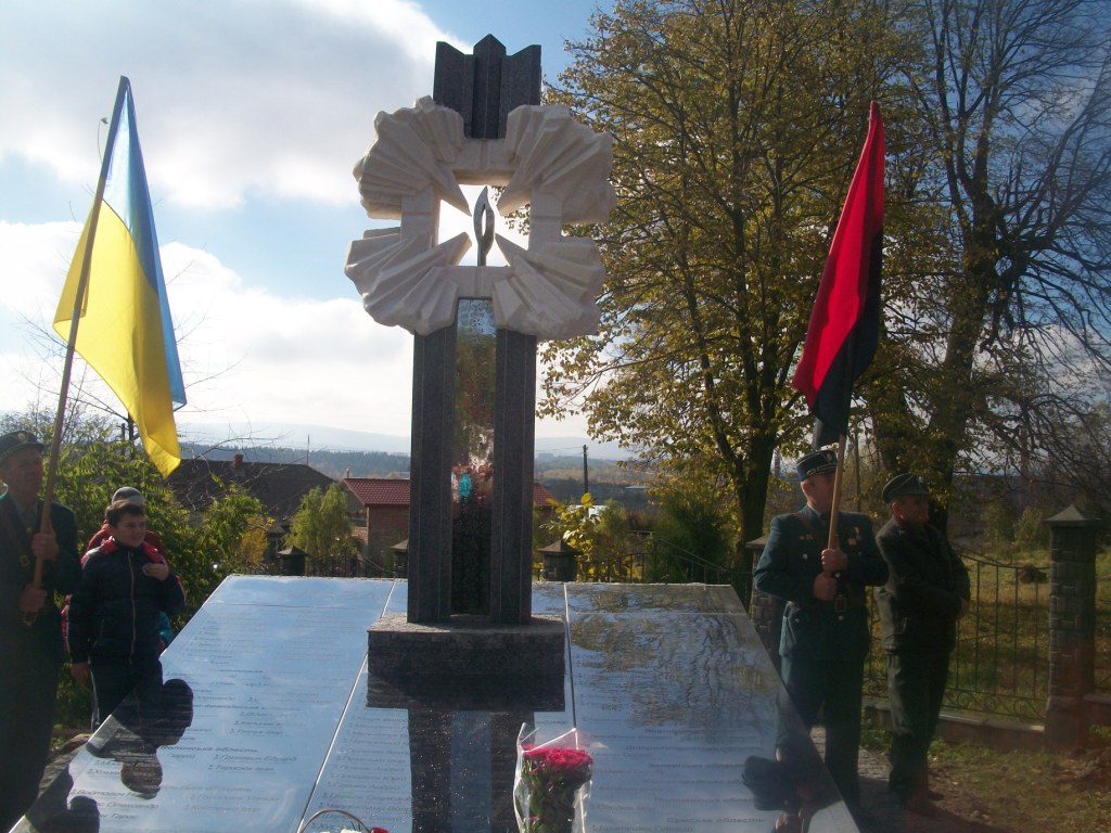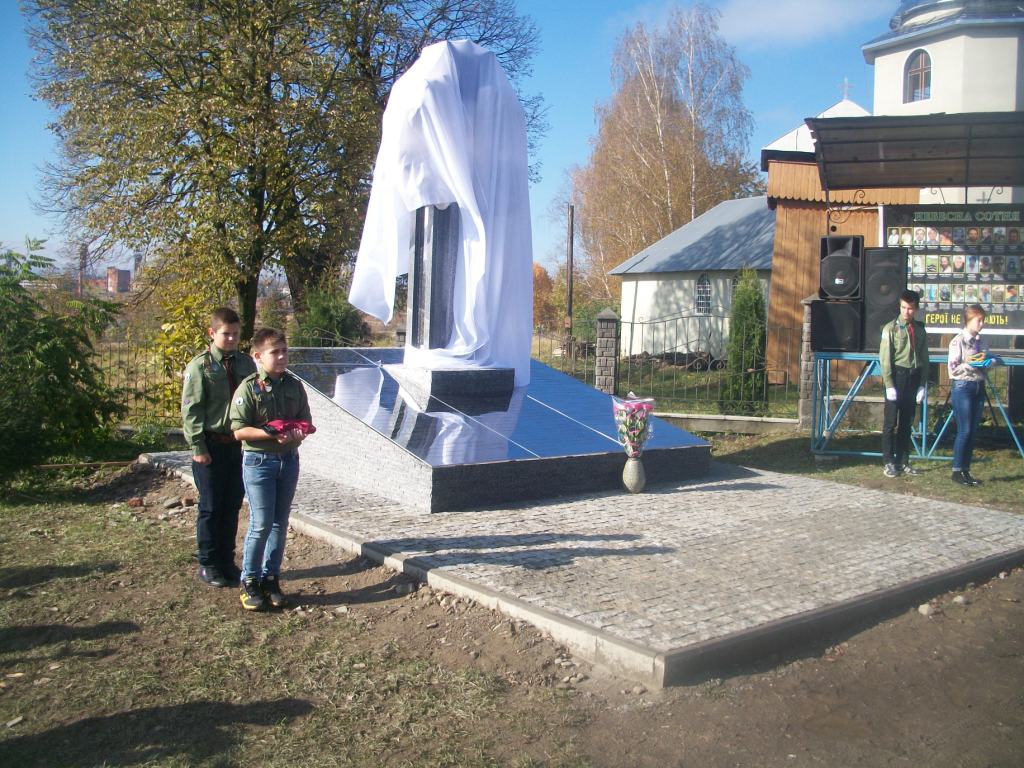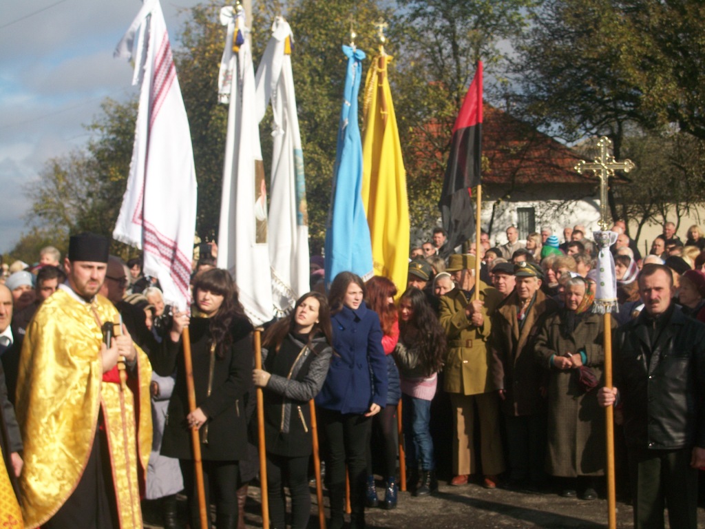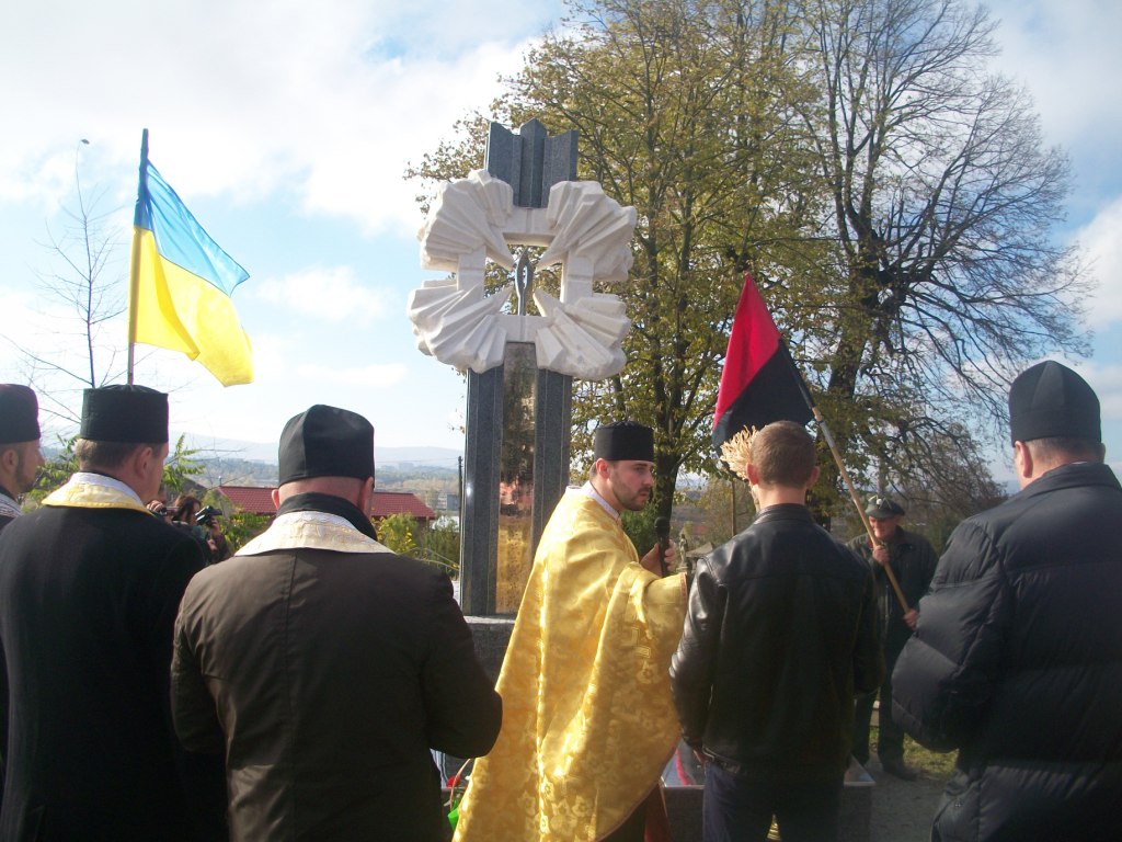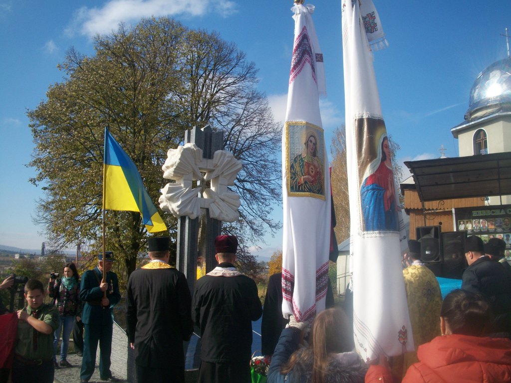 Грає військовий оркестр з Дрогобича. Майорять жовто-сині та червоно-чорні прапори, тріпоче вітер церковні хоругви та листя на деревах. Почесну варту несуть пластуни та сивочолі бійці УПА. Восьмеро священиків освячують хрест-монумент, під яким написи – згадка про всіх Героїв Небесної Сотні. Сумно лине над Колпцем «Плине кача по Тисині», голос ведучої з тремтінням вимовляє прізвища наших земляків, які загинули. Загинули на Майдані, в АТО, і вдома – від отриманих травм. Ігор Борис, Ігор Дідач, Дмитро Лесешак, Михайло Фарима, Сергій Шевчук, Артур Гулик, Степан Бродяк, Андрій Шіхт і це далеко не повний перелік… Люди плачуть, витирають очі і схлипують. Це ж наші брати, сусіди, друзі, їх так нагло, несподівано забрала смерть.