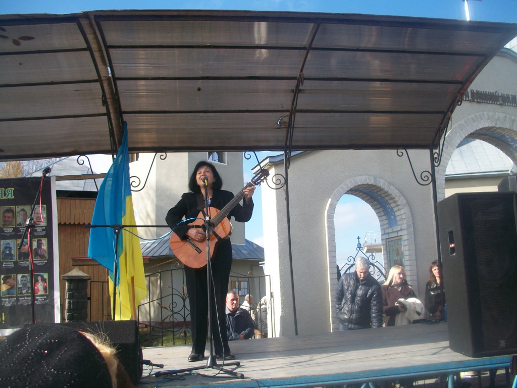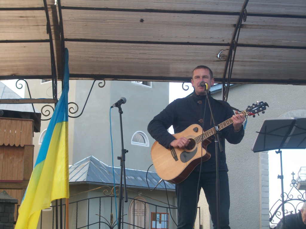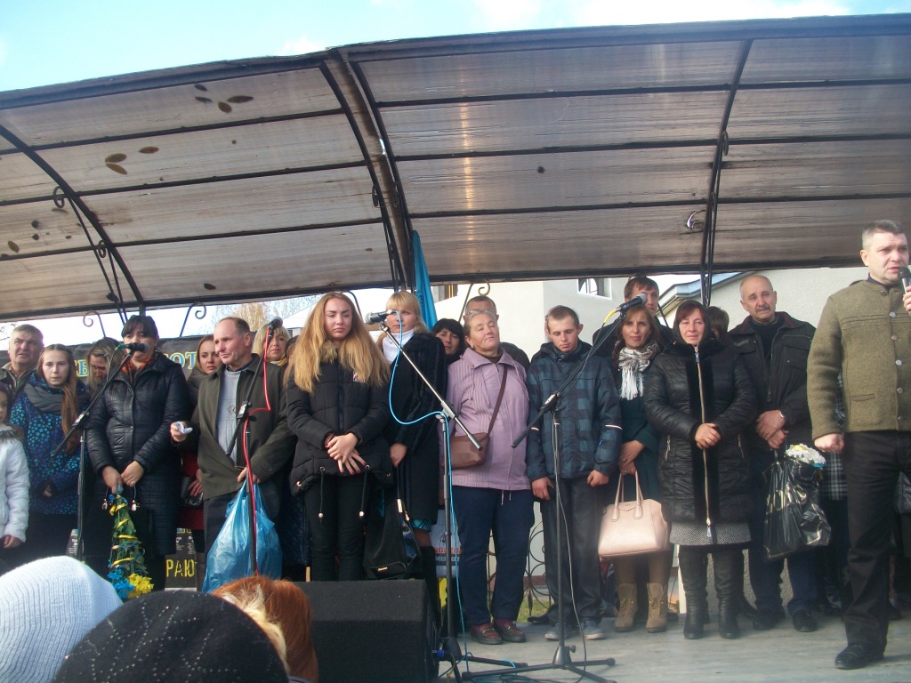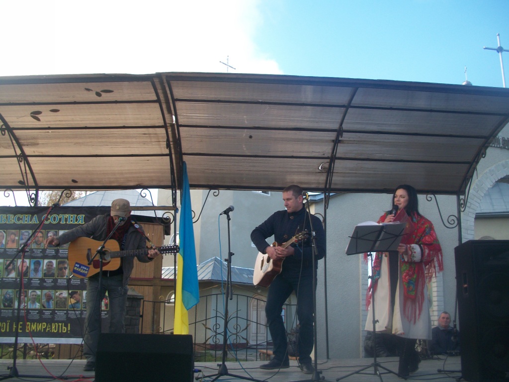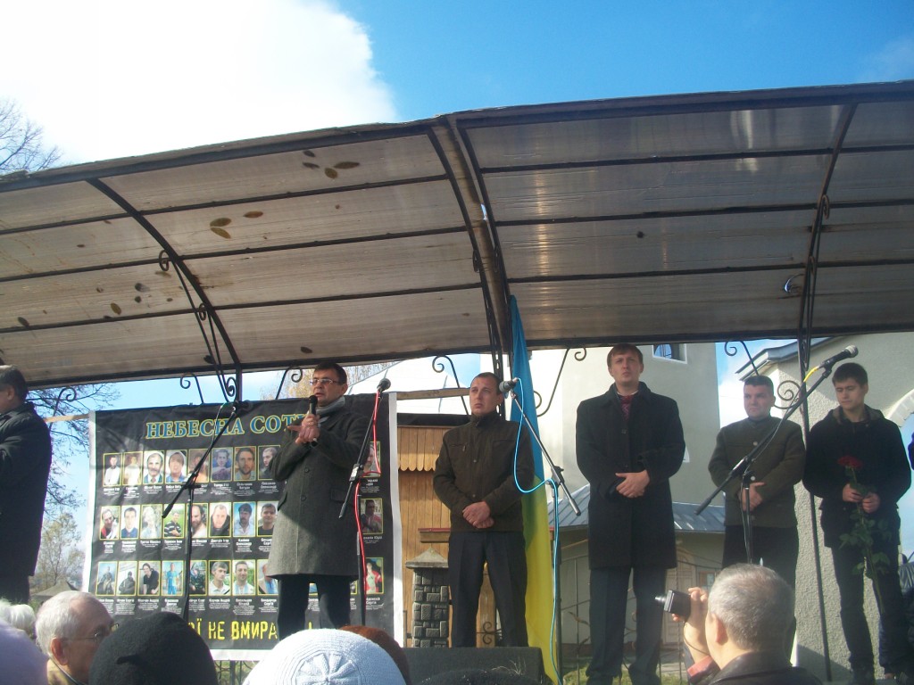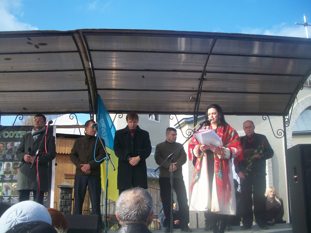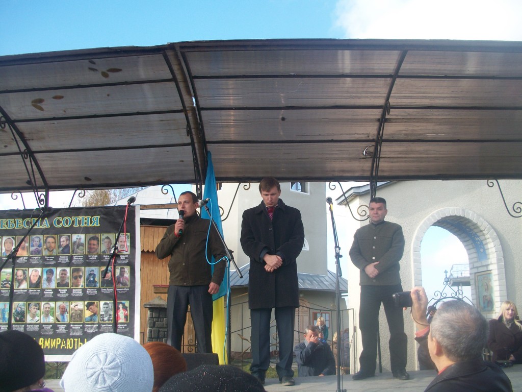 Із-за хмар визирає сонце і висушує сльози людей, присутніх на освяченні та віче. Стихає вітер і прислухається до слів майданівця Романа Тітика з Ходорова. Чому коли почалися обстріли, раптово щезли всі політики? Де вони поділися? Де була «трійка», «куля в лоб», чому їх не було видно? А снайпери косили хлопців як недостигле жито, кров фарбувала лютий-2014 у брунатний колір, колір смерті.