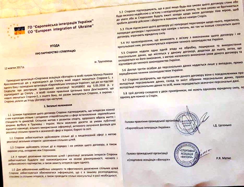 12 жовтня в залі ресторану готелю «Оскар» (м. Трускавець) відбулося підписання угоди про партнерство та співпрацю між громадською асоціацією «Європейська інтеграція України» (голова правління Іван Цегенько) та Спортивною асоціацією «Вікторія» (голова ГО Роман Матис). Ці дві громадські організації вирізняються посеред багатьох інших активністю та спрямованістю на результат.