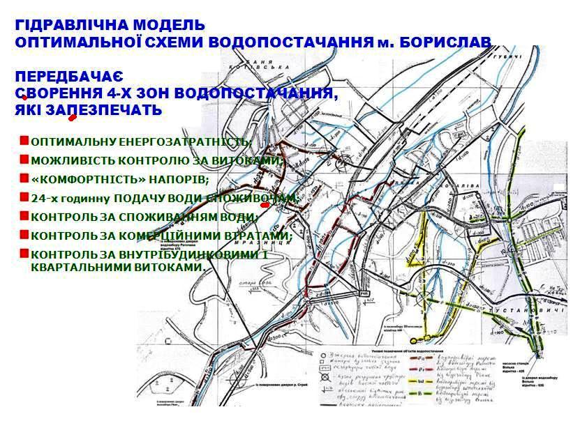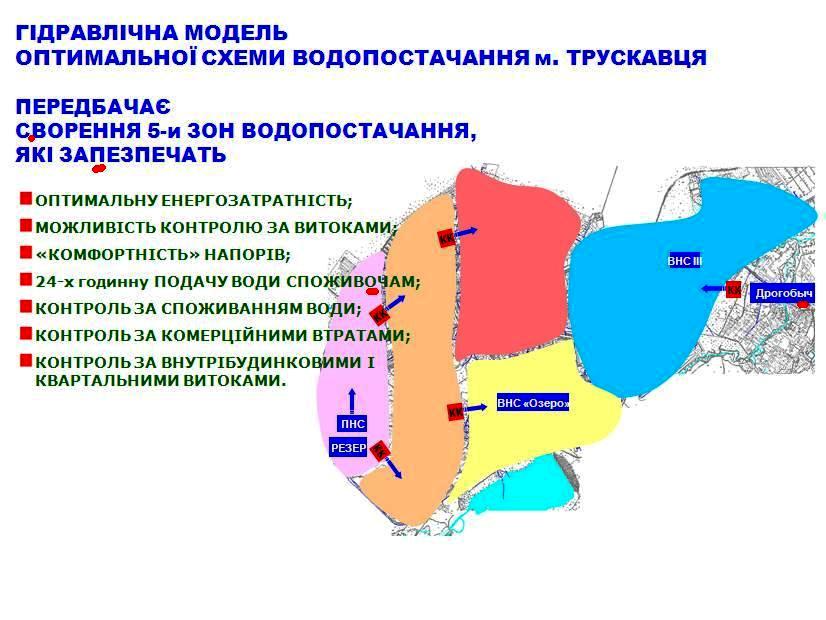 «Треба розробити гідравлічні моделі схеми водопостачання Трускавця та Борислава», – підсумував доповідач і наочно показав, як приблизно мають виглядати 5 зон (по перепадах місцевості), які забезпечать оптимальну енергозатратність, «комфортний» напір та контроль за витоками і за споживанням води. Ця схема дасть можливість цілоденного водопостачання, але потребує великих коштів. Втім, кошти можна залучити з Європейського банку реконструкції та розвитку, можна домогтися і залучення державних чи обласних коштів. Адже мова йде про стратегічний ресурс – воду, та про забезпечення цим ресурсом агломерації міст, яка колись планувалася як єдине місто Прикарпатськ з півмільйонним населенням.