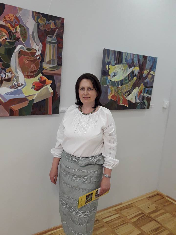 На стінах – картини, по периметру – поціновувачі мистецтва, по центру – юні вихованці Лесі Баб`як співають під бандуру, а в кутику – сама мисткиня: красива, скромна, світла, як і її твори.