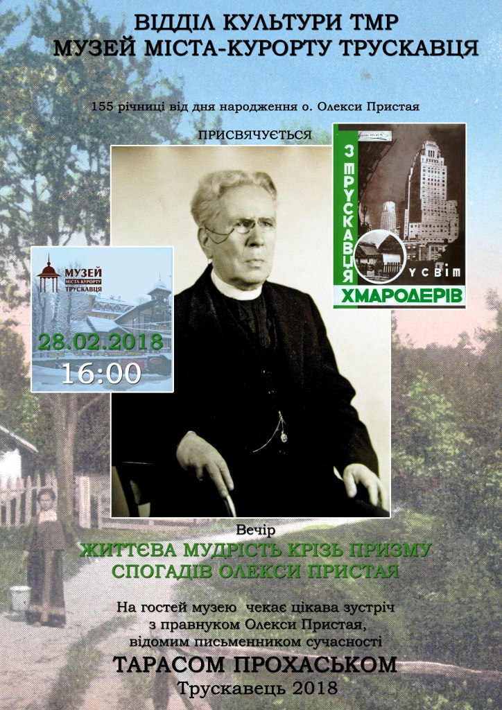 В останній день лютої зими у музеї історії Трускавця відбувся незвичайний захід – вечір «Життєва мудрість крізь призму спогадів отця Олекси Пристая». Організатори постаралися на славу, бо вечір вдався, вийшов пречудовим, а найприємніше те, що було для кого готуватися – на зустріч прийшло досить багато трускавчан, переважно представники інтеліґенції.