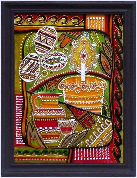 Кожна робота – наче окрема розповідь. Тут гомонять між собою Різдвяний вертеп і Великодні дзвони, кличуть у казку Купальські дива. А в цій – літають сонячні птахи і пасуться чарівні олені. Ось козаки мчать на баских конях, а чумаки ліниво погойдуються на волах, виграючи на сопілці безкінечну, як зоряний шлях, мелодію. Тут розкривають свої таємниці трипільські кручі і росте диво-дерево бажань, тут панують неповторне диво і казка, що повертають нас у блаженний стан, який буває тільки в дитинстві — в передчутті великого свята.