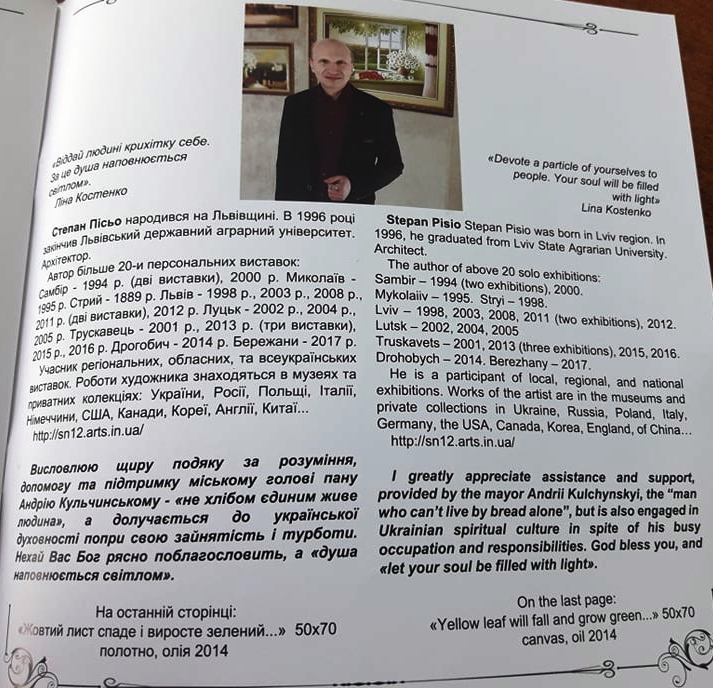 У неділю, 30 червня, в музеї історії Трускавця (директор Галина Коваль) відбулася презентація буклету «Світло казкового міста», присвяченого трускавецьким мотивам живопису художника. Як зазначив на презентації голова Спілки художників Трускавця Олег Олексин, небагато з художників-трускавчан малює рідний Трускавець, темою їх картин більше є Львів, Карпати, інші місцевості. А от Степан Пісьо малює, та ще й як! Пан Олег запропонував видати листівки з зображенням картин митця, щоб ті, хто не має можливості купити картину, могли повезти з відпочинку додому частинку Трускавця як згадку про наш курорт і як стимул повертатися сюди і за здоров`ям, і за спогляданням красот.