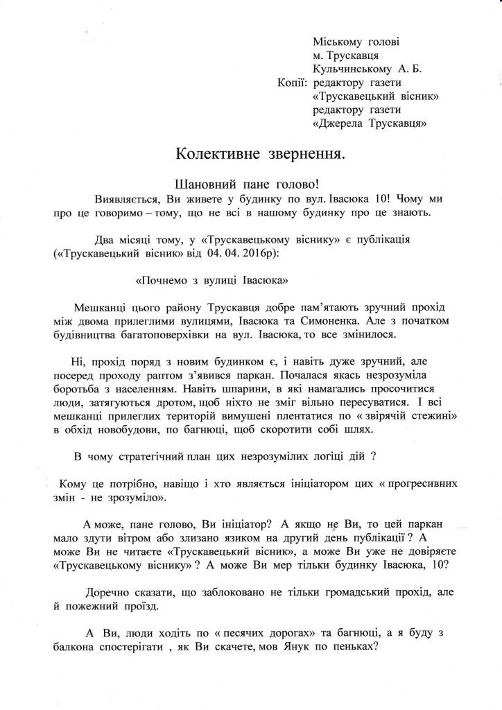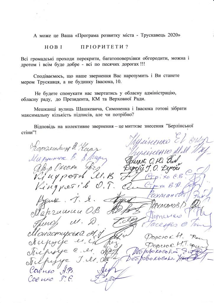 Колективне звернення до міського голови Трускавця з приводу паркану на вул. Івасюка
