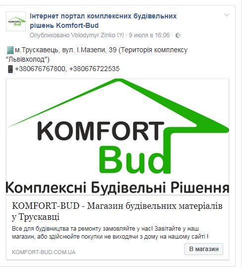 Більше інформації про магазин «КомфортБуд» – на сайті https://komfort-bud.com.ua або на сторінці в мережі Фейсбук https://www.facebook.com/komfortbud2016/posts/449922738712999