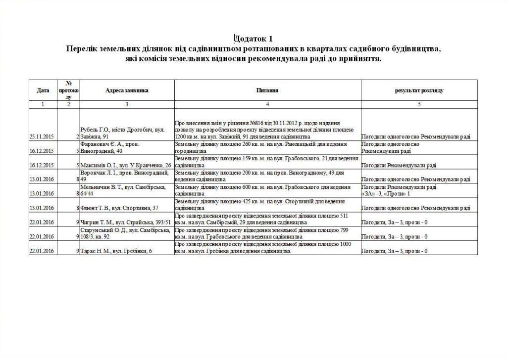 1. Генеральний план м. Дрогобича передбачає дві зони для виділення земельних для ведення садівництва-район заводу “Граніт” та площі вище об’їзної дороги з вул. Самбірської на вул. 22 січня. Необхідно розробити детальне планування вказаних територій і проводити виділення земельних ділянок під садівництво на вказаних територіях.