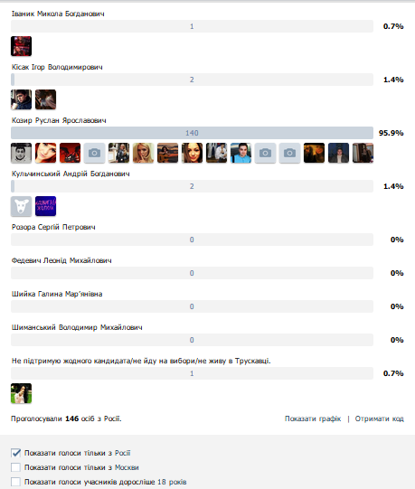 У одній з груп соціальної мережі «Вконтактє» відбувається онлайн-голосування за кандидатів у мери Трускавця. Користувачі «Вконтактє» у трійку лідерів виводять Андрія Кульчинського, Ігоря Кісака та Руслана Козира. Та що цікаво, майже усі люди, які віддали голоси за останнього – з Росії. Про це свідчать дані, отримані з рейтингового опитування. А саме, акаунти 95,9% користувачів, які проголосували за Руслана Козира – російські (див. картинку).