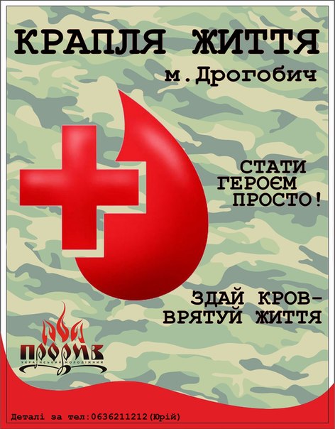 Останнім часом Україною прокотилася потужна хвиля благодійних акцій здачі крові, адже через напружену ситуацію у країні лікарні гостро відчувають потребу у донорській крові. Не виключенням є і Дрогобич, де активісти МГО «Український молодіжний прорив» розпочали благодійну акцію «Крапля життя» з безоплатної здачі донорської крові для поранених бійців антитерористичної операції.