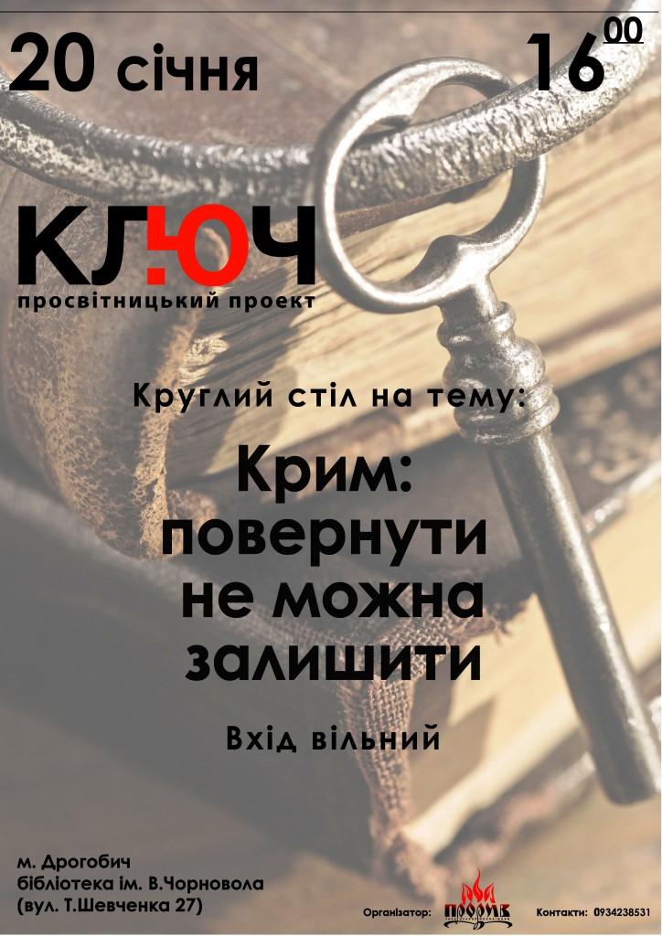 Як інформує прес-служба МГО “Український молодіжний прорив”, у середу, 20 січня, о 16.00 в приміщенні Дрогобицької міської бібліотеки ім. В.Чорновола, що за адресою вул. Т.Шевченка, 27 у рамках Просвітницького проекту “КЛЮЧ” відбудеться круглий стіл на тему “Крим: повернути не можна залишити”. Модератор заходу – Юрій Дрогобицький.