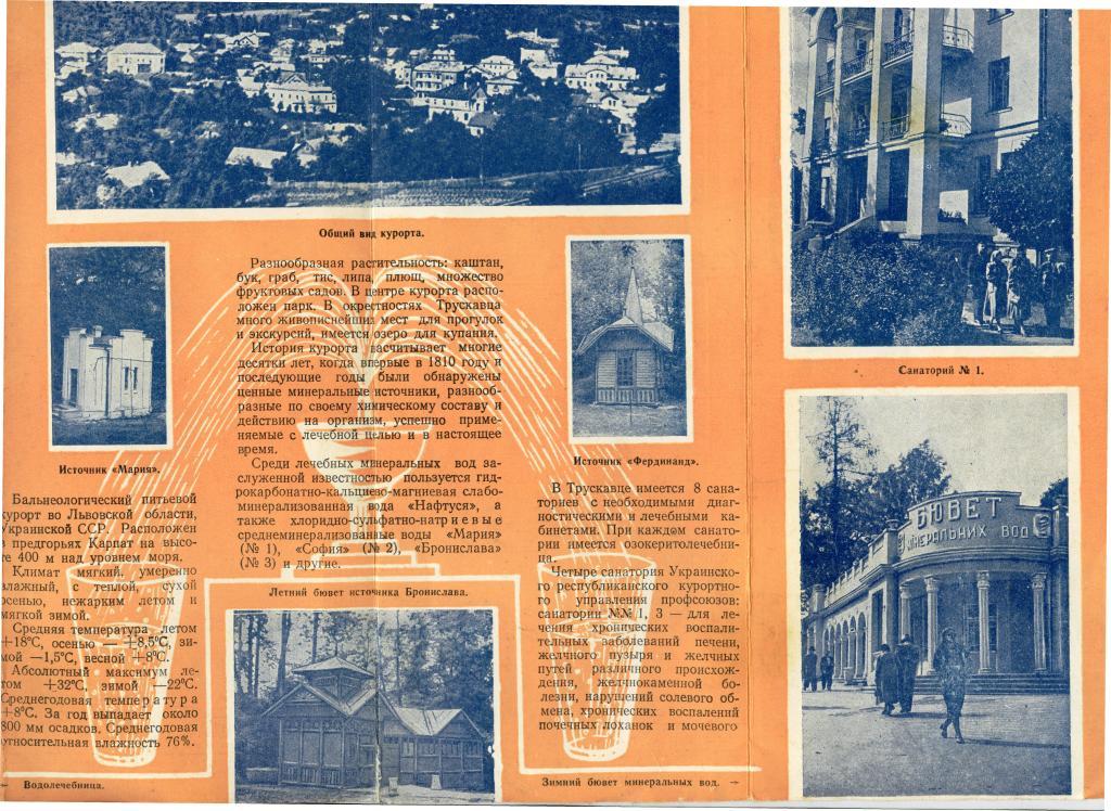 Крім фотоальбому подаємо один з перших промоційних буклетів про Трускавець радянського періоду. Буклет «Курорт Трускавец» видано російською мовою у 1960 році, більшу його частину складають фотографії (16 фото: загальний вид курорту та парку, корпуси санаторіїв, світлини джерел тощо). В текстовій частині розповідається про лікувальні властивості трускавецьких лікувальних вод, подано інформацію про клімат, географічне розташування, рослинність та тваринний світ, погоду, коротко подано історичні моменти. На 1960 рік у Трускавці було 8 санаторіїв, при кожному з них була озокеритна лікарня. Подано хвороби, які лікують на курорті Трускавець. Буклет також надано п. Володимиром Саратовським, за що йому сердечно дякуємо.