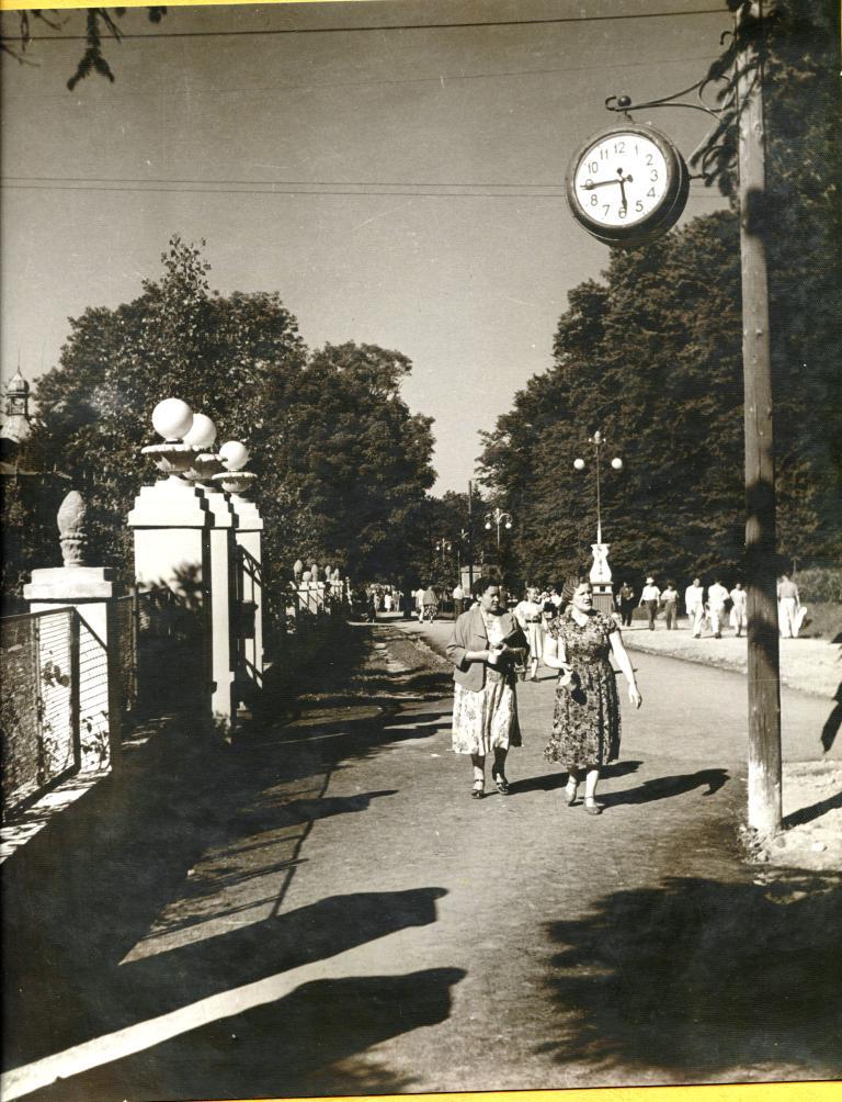 14. Вулиця, якою прямують ці дві жінки, від курортного парку йде до санаторію «Кришталевий палац». Ліворуч – вхід до санаторію.