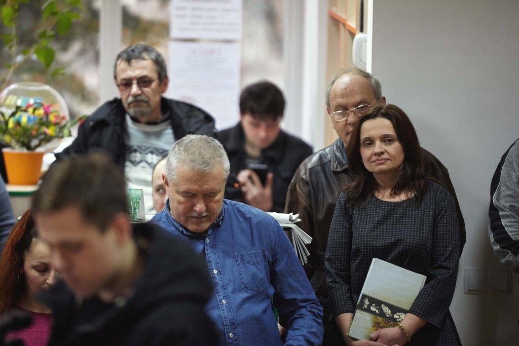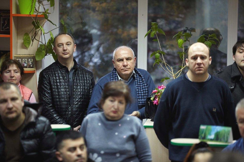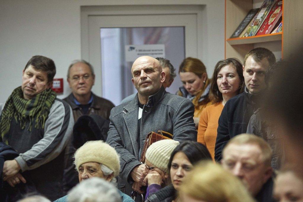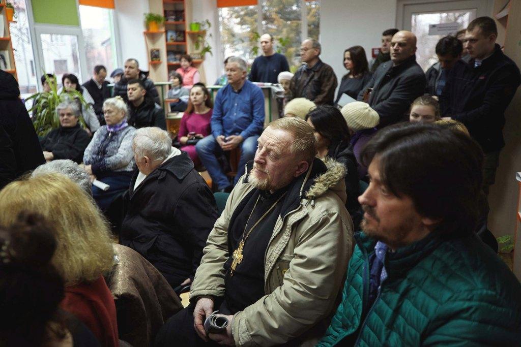 Камерний зал не міг вмістити всіх бажаючих послухати Лева Грицака. Всі місця зайняті (навіть на підвіконниках), тож багатьом доводиться стояти. Серед учасників зустрічі – працівники культури, воїни АТО, священнослужителі, поети, депутати цього та попередніх скликань, громадські діячі, юристи, журналісти, члени міської асоціації інвалідів і звичайні громадяни міста, котрі зацікавилися подією.