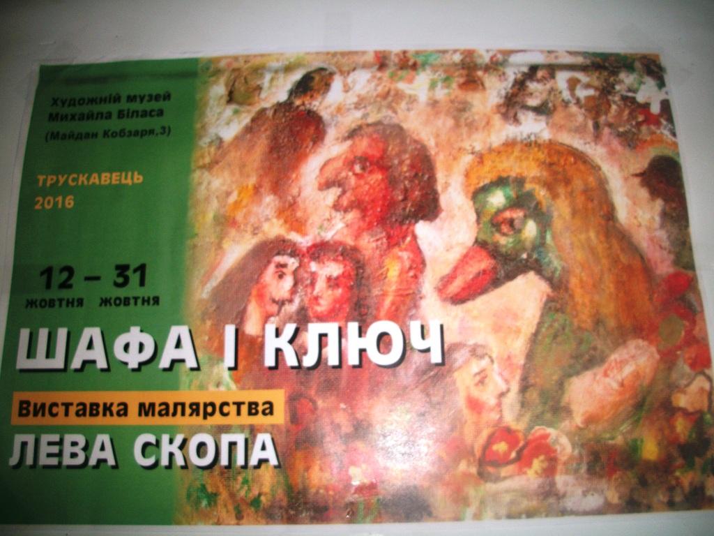 …Відкриття виставки робіт Лева Скопа «Шафа і ключ» в трускавецькому музеї Михайла Біласа завершилося оглядом творів та фуршетом. Гості мали можливість придбати книги Лева Скопа. Виставка «Шафа і ключ» експонуватиметься у Трускавці до 31 жовтня.
