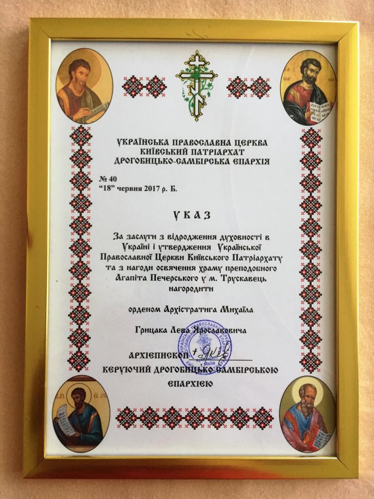 Генеральний директор Трускавецького готельно-курортного комплексу «Карпати», міський голова Трускавця 2002-2010 років, Заслужений лікар України Лев Грицак нагороджений орденом Архистратига Михаїла Української Православної Церкви Київського патріархату. Орденом його нагороджено «за заслуги відродження духовності в Україні». Відповідний Указ видав архієпископ Дрогобицько-Самбірський УПЦ КП Яків.