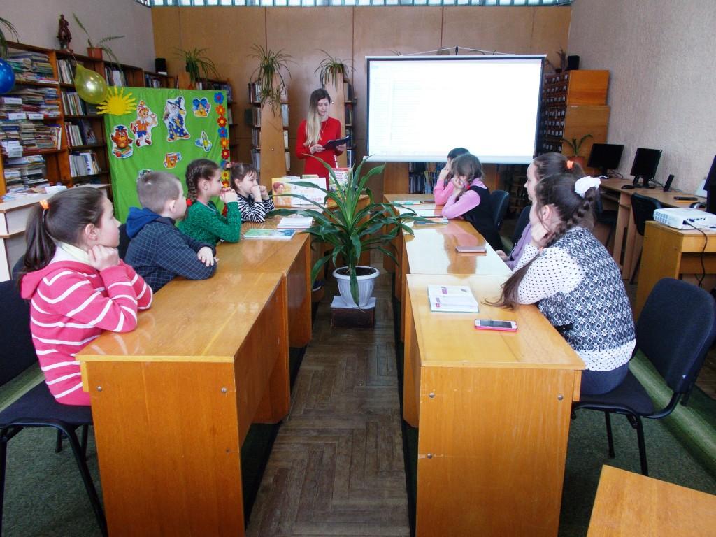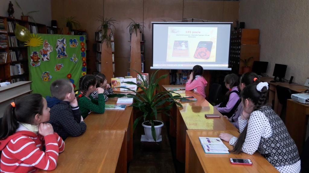 Бібліотекар Наталія Кирилів розповіла присутнім про письменників-ювілярів 2018 року. Діти переглянули буктрейлери “Книги-ювіляри 2018”, В.Близнець “Звук павутинки”, на книгу Люсі Мод Монтгомері “Енн із Зелених Дахів”.