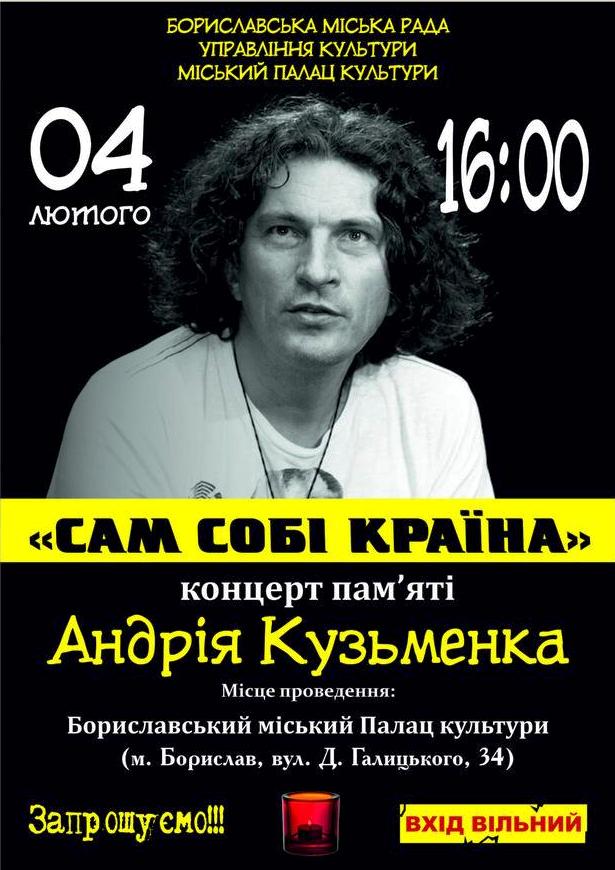 «Люди помирають, але слова залишаються». Ця фраза з відеоролику, показаного під час вечора пам`яті Кузьми Скрябіна, який проходив у неділю, 4 лютого, в Бориславському міському Палаці культури, може бути приводом для роздумів не на один день. Так, люди помирають, проте залишаються їхні нащадки, їхні діла і … їхні слова. Слова, які придумав, записав, поклав на музику і виконав Андрій Кузьменко-Скрябін, давно стали народними. Як і він став народним артистом – без титулів, які надає влада, але тим почесним званням, яким титулував його сам народ.