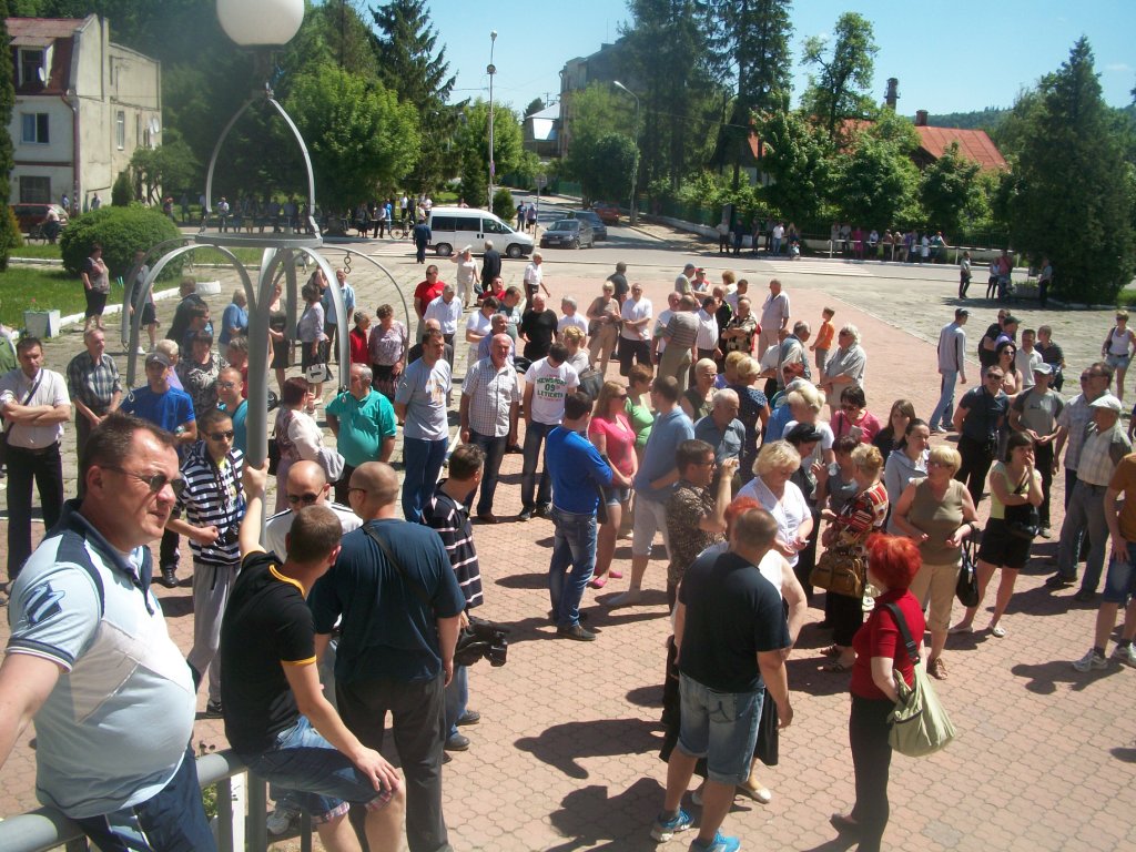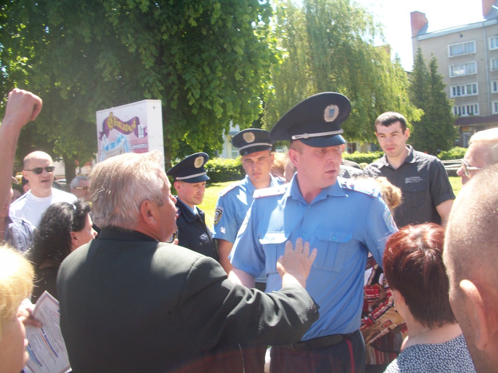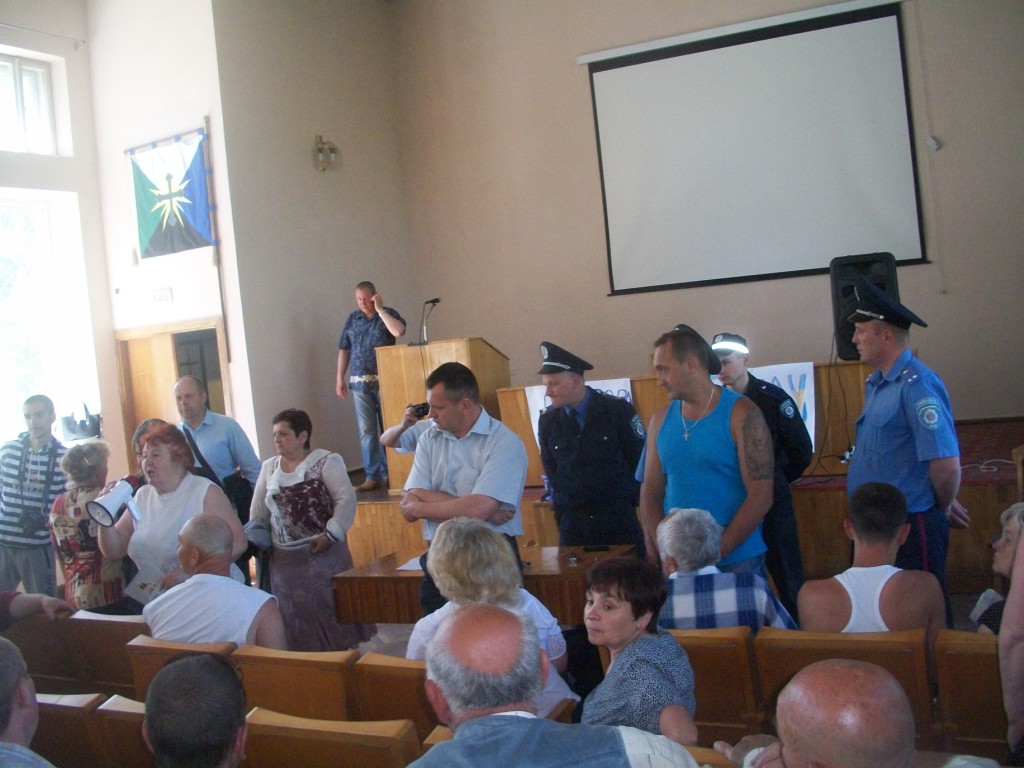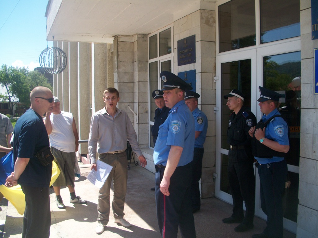 Перед міською радою їх вже чекав наряд міліції. Семеро (якщо не більше правоохоронців) відмовилися пропускати всіх до мерії, мотивуючи тим, що в приміщенні є виборча документація. Кілька представників громади пересвідчилися, що міського голови в будівлі немає. Цікаво, що вони не змогли зайти в жоден із кабінетів, всюди було зачинено, хоча з вікон визирали, а кажуть, що навіть показували язики, окремі чиновниці. Оскільки годинник показував 13.29 (час обіду), то вирішили мера все-таки дочекатися. Цей час багато хто використав, щоб дати коментар оператору телекомпанії «Алсет» (м. Дрогобич).