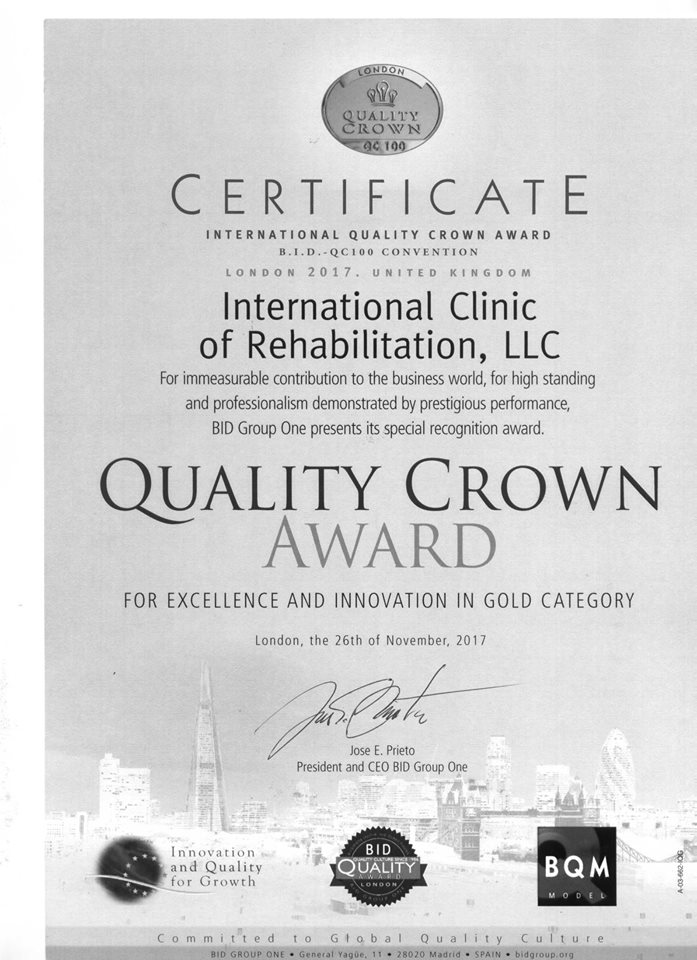 «Вручення Kорони міжнародної якості представникам Клініки відновного лікування ще раз підтвердило європейський рівень та високі стандарти нашого медичного закладу», – зазначають у Міжнародній клініці відновного лікування.