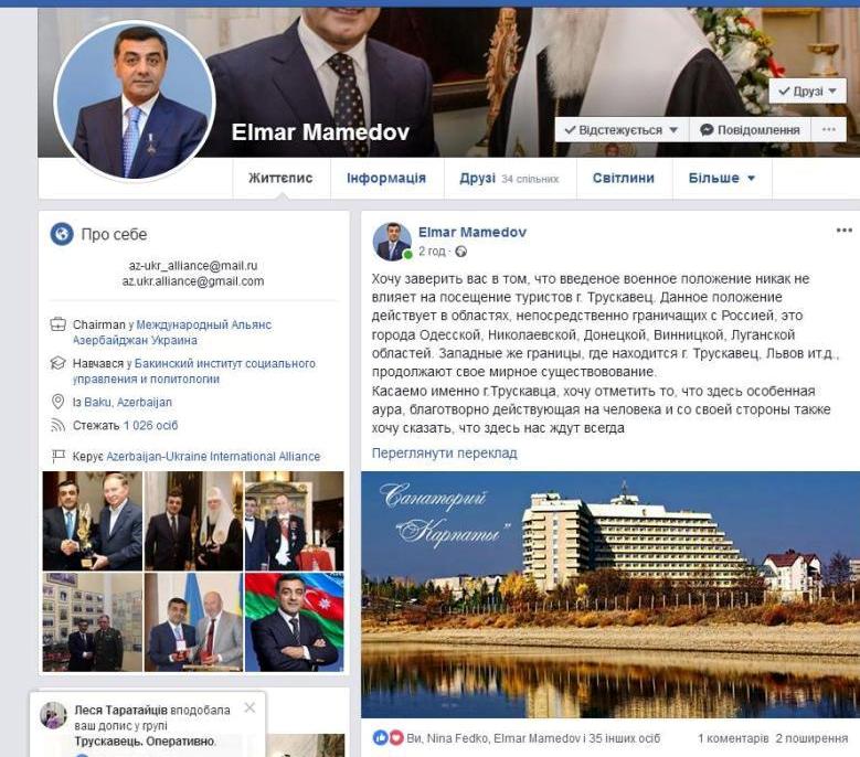 Свою заяву в мережі Фейсбук Ельмар Мамедов проілюстрував зображенням Трускавецького готельно-курортного комплексу «Карпати».