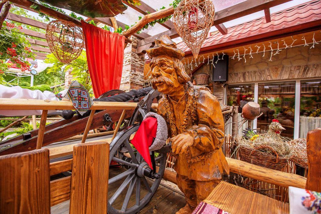 Абсолютна більшість всього, що ми побачимо на терасі, зроблена з дерева. Дерев`яна фіра, дерев`яні фігури селянина, єврея, козака та інших персонажів (справжні витвори мистецтва, до речі!), колеса, які відмежовують простір тераси від довкілля, столи, стільці, огорожа, покрівля, предмети селянського побуту. Дерево як натуральний елемент сприяє кращому відпочинку, віддає людині свою позитивну енергетику, запрошує відпочити від світу комп’ютерів, пластику, металу, від штучності та фальші. Хороша кухня і надзвичайно милий персонал доповнюють гармонію інтер`єру та екстер’єру.