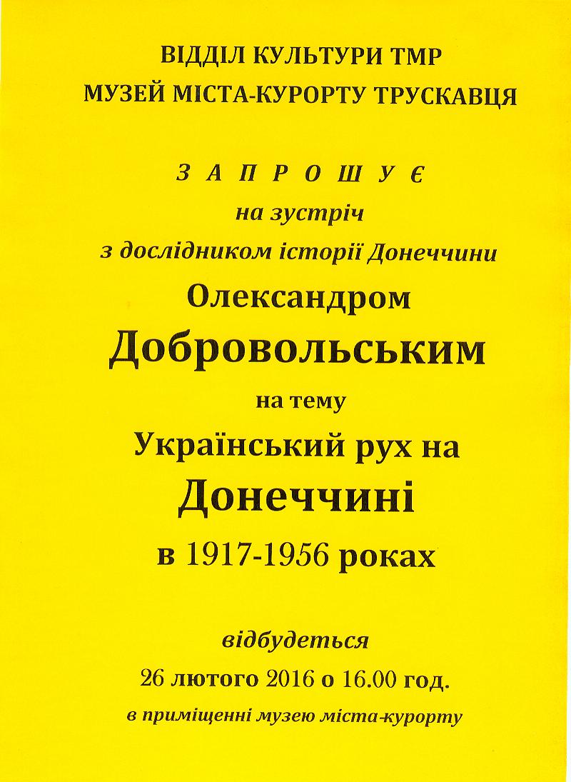 У п’ятницю, 26 лютого, в музеї міста-курорту Трускавця відбудеться зустріч з дослідником історії Донеччини першої половини ХХ ст. Олександром Добровольським, який проведе лекцію на тему «Український рух на Донеччині в 1917-1956 роках». В лекції буде розкрито тему діяльності підпільних осередків ОУН та репресивних дій тодішнього тоталітарного режиму проти українського народу та церкви. Організатори зустрічі обіцяють, що вона буде цікавою для учасників.