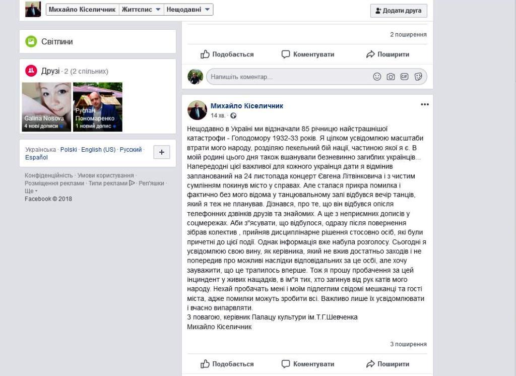 «Нещодавно в Україні ми відзначали 85 річницю найстрашнішої катастрофи – Голодомору 1932-33 років. Я цілком усвідомлюю масштаби втрати мого народу, розділяю пекельний бій нації, частиною якої я є. В моїй родині цього дня також вшанували безневинно загиблих українців… Напередодні цієї важливої для кожного українця дати я відмінив запланований на 24 листопада концерт Євгена Літвінковича і з чистим сумлінням покинув місто у справах. Але сталася прикра помилка і фактично без мого відома у танцювальному залі відбувся вечір танців, який я теж не планував. Дізнався, про те, що він відбувся, опісля телефонних дзвінків друзів та знайомих. А ще з неприємних дописів у соцмережах. Аби з`ясувати, що відбулося, одразу після повернення зібрав колектив, прийняв дисциплінарне рішення стосовно осіб, які були причетні до цієї події. Однак інформація вже набула розголосу. Сьогодні я усвідомлюю свою вину як керівника, який не вжив достатньо заходів і не попередив про можливі наслідки відповідальних за це осіб, але хочу зауважити, що це трапилось вперше. Тож я прошу пробачення за цей інцидент у живих нащадків, в ім.`я тих, хто загинув від рук катів мого народу. Нехай пробачать мені і моїм підлеглим свідомі мешканці та гості міста, адже помилки можуть зробити всі. Важливо лише їх усвідомлювати і вчасно виправляти. З повагою, керівник Палацу культури ім. Т.Г. Шевченка Михайло Кіселичник», – написав слова вибачення на своїй сторінці в соцмережі Фейсбук Михайло Кіселичник.