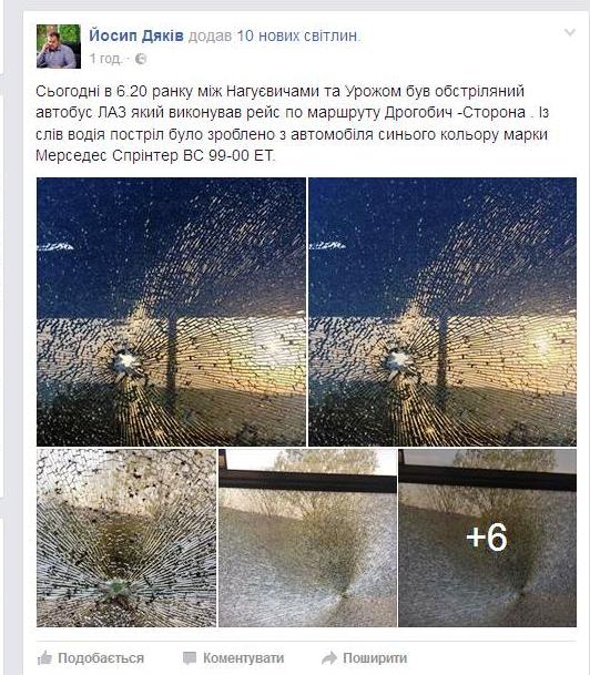 Сьогодні, 26 квітня, о 6.20 між селами Нагуєвичі та Уріж (Дрогобицький район) був обстріляний автобус ЛАЗ, який виконував рейс на маршруті «Дрогобич-Сторона». Про це на своїй сторінці в мережі Фейсбук інформує керівник ТзОВ «Транс-Екіпаж» Йосип Дяків.