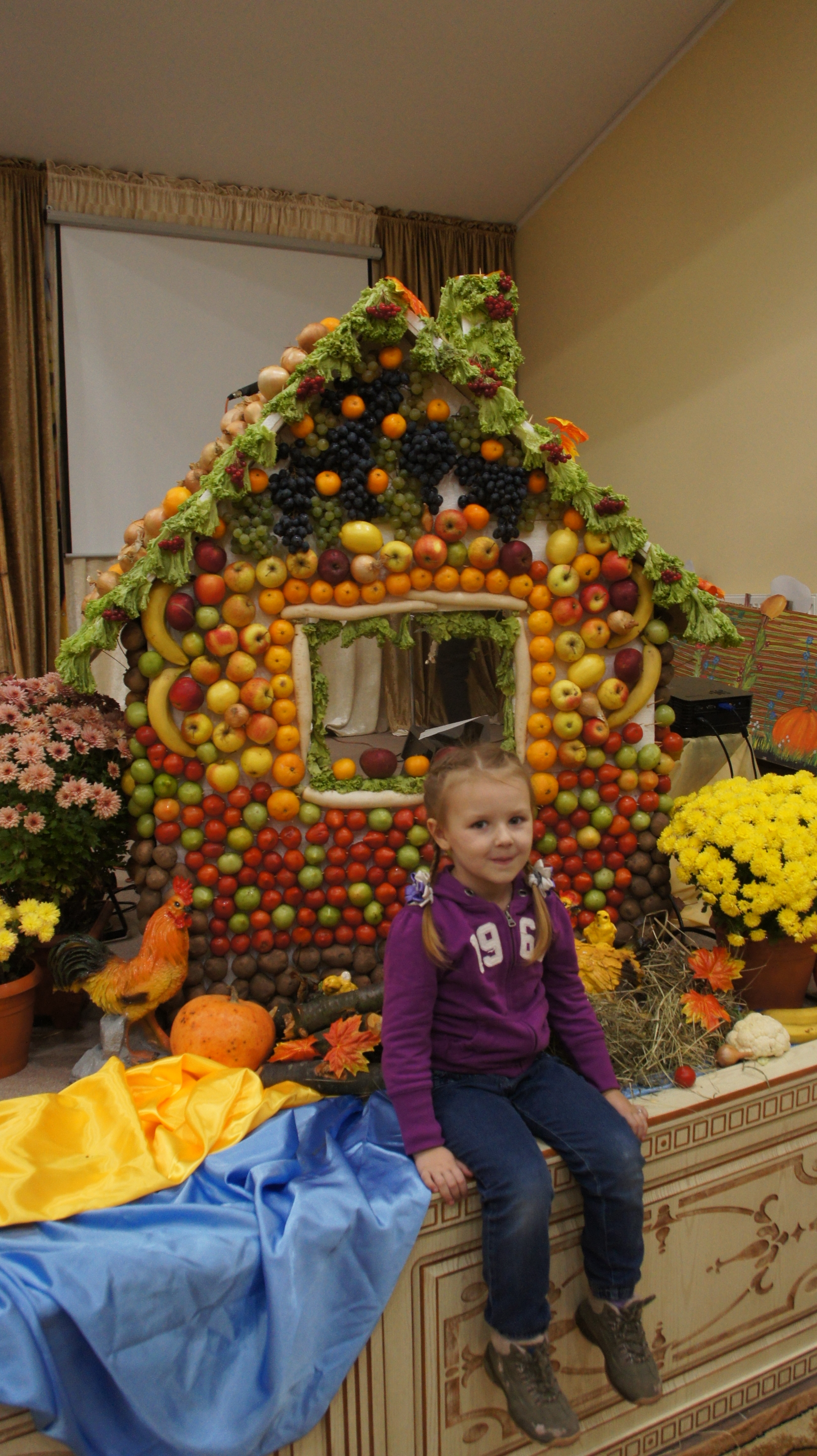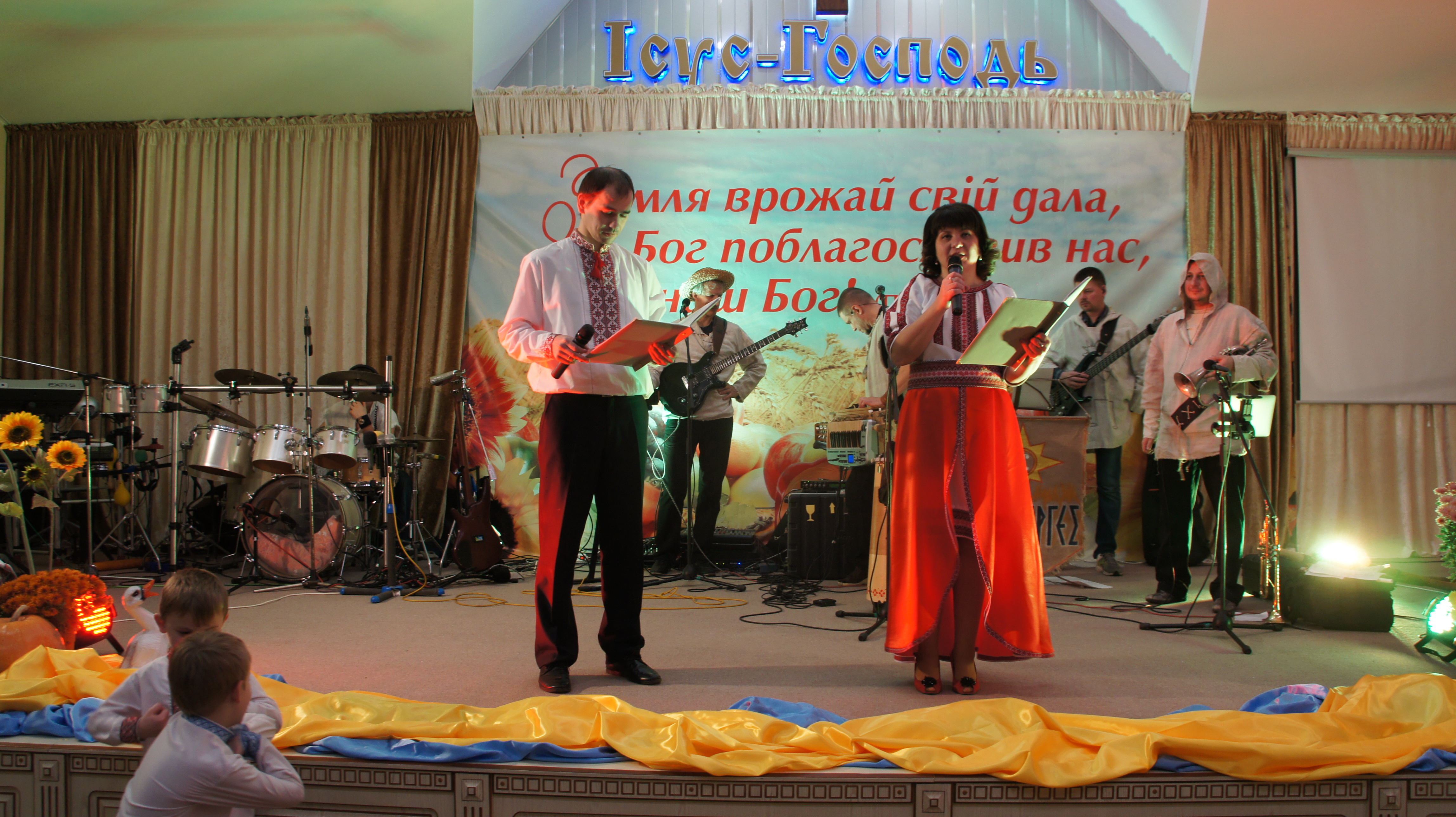 Вихованці “недільної школи”, одягнені в “фруктові” та овочеві” костюми, розіграли невеличку виставу та донесли до присутніх важливість подяки. Діти розповідали вірші, співали пісні, прославляючи Бога та дякуючи за його щедрість. Церковна сцена перетворилась на сучасний декорований город з маленьким дерев’яним будиночком, викладеним з усіх сторін різнобарвними овочами та фруктами.