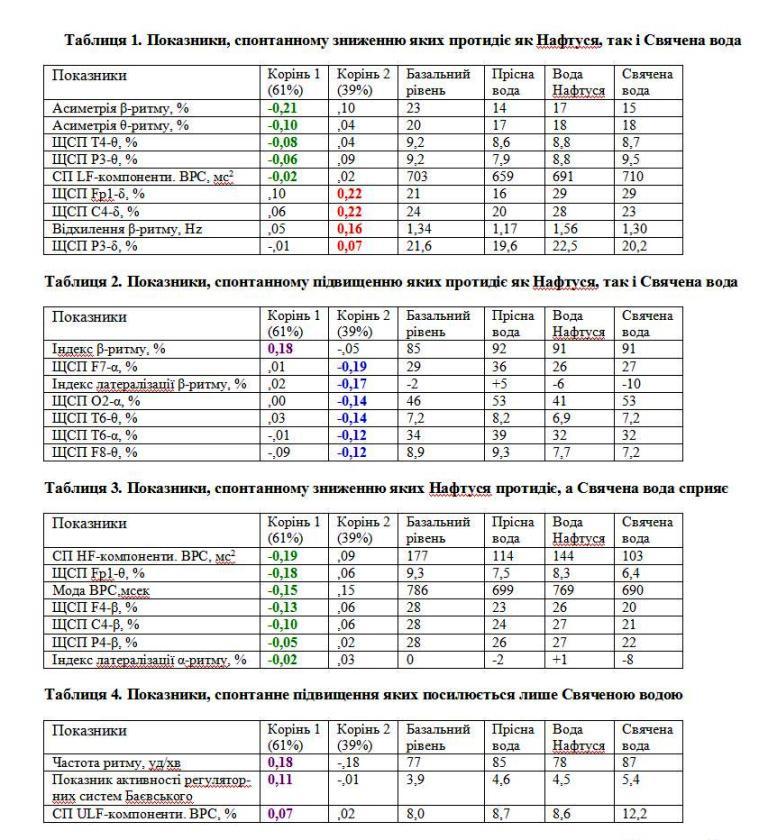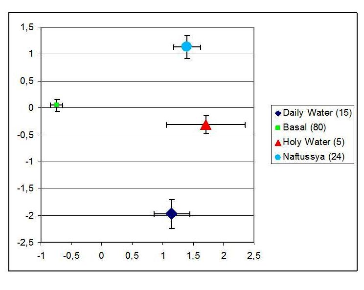 Як видно, через півтори години після вживання 200 мл прісної води стан біоелектричної активності головного мозку суттєво зміщується вправо і вниз від початкового. Але це зумовлено не дією води, яка неефективна, тому що звична для організму, а ходом біоритмів (переходом організму від сну до активної діяльності). Іншими словами, виявлені зміни є спонтанними (самовільними). Разом з тим, після вживання як 200 мл Нафтусі, так і 50 мл Свяченої води значки двох інших дослідів зміщуються вздовж осі першого кореня (X) ще більше вправо, що свідчить про більш виражені зміни окремих показників біоелектричної активності, причому приблизно однаковою мірою. Отже, нейротропні ефекти Нафтусі і Свяченої води стосовно показників, інформація про які міститься у першому корені (зелені і фіолетові), майже однакові! Отже, підтверджено вислів, що цілюща Нафтуся – це Божий дар! В ній, окрім органічних речовин і автохтонної мікрофлори, міститься, як і у Свяченій воді, Божественне начало! Натомість вздовж осі другого кореня (Y) віддалі між значками, котрі характеризують стан мозку, значно більші, тобто нейротропні ефекти Нафтусі і Свяченої води відрізняються, що цілком природно і очікувано.