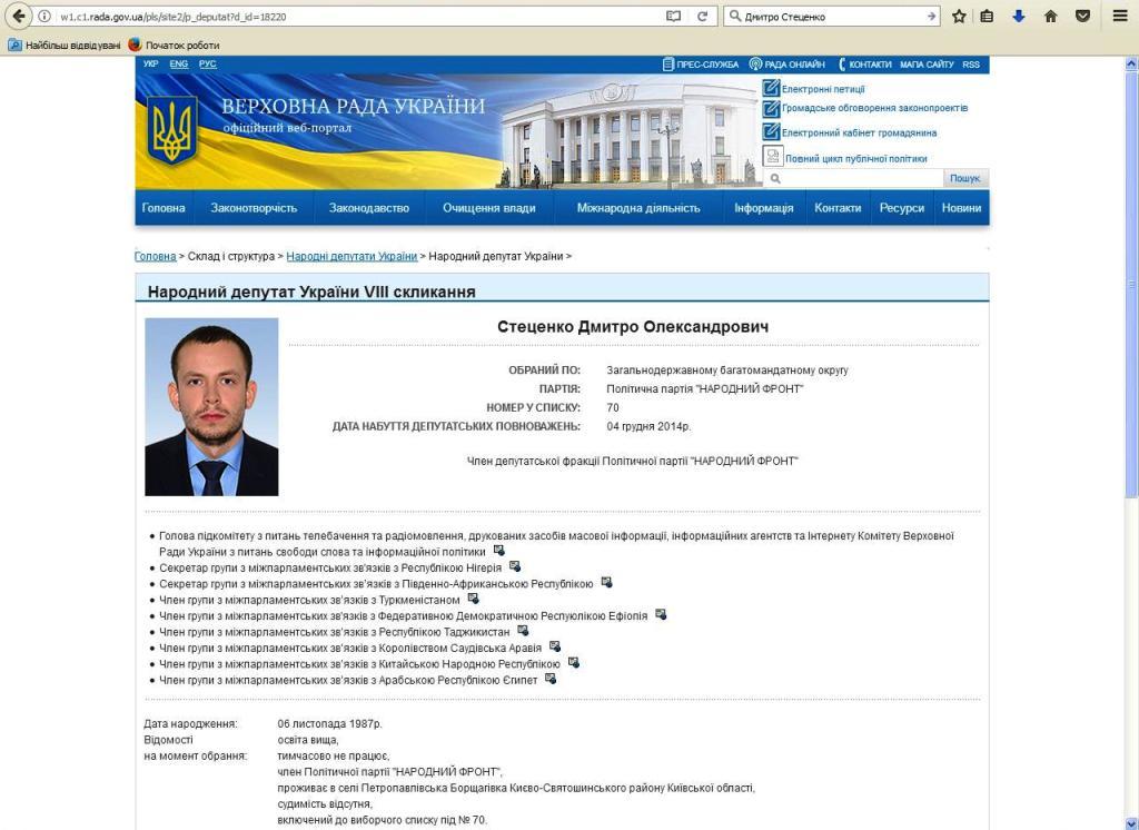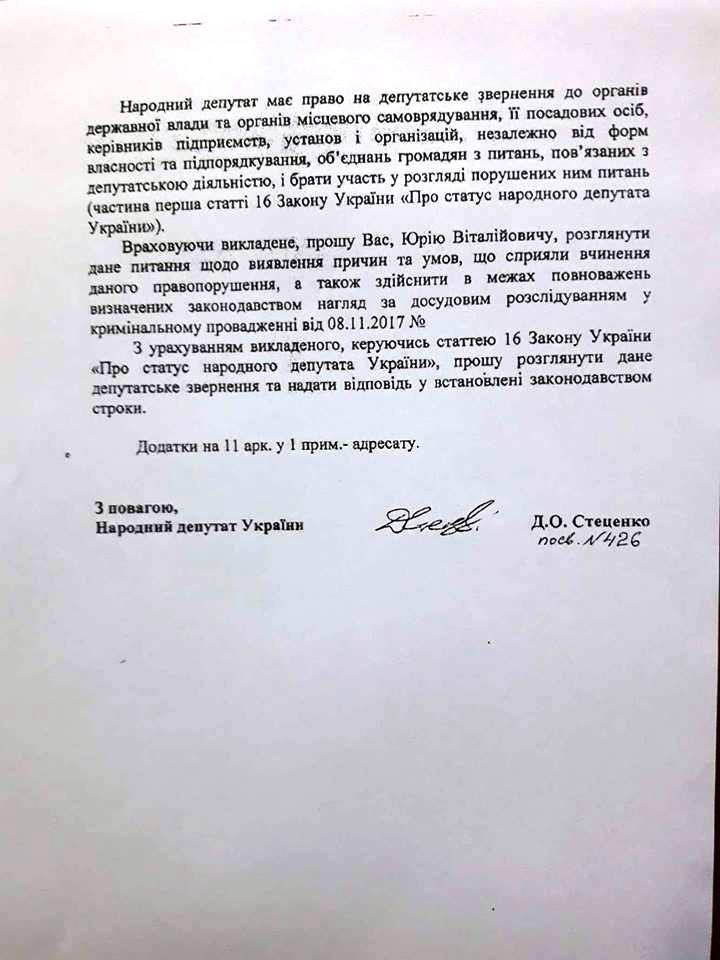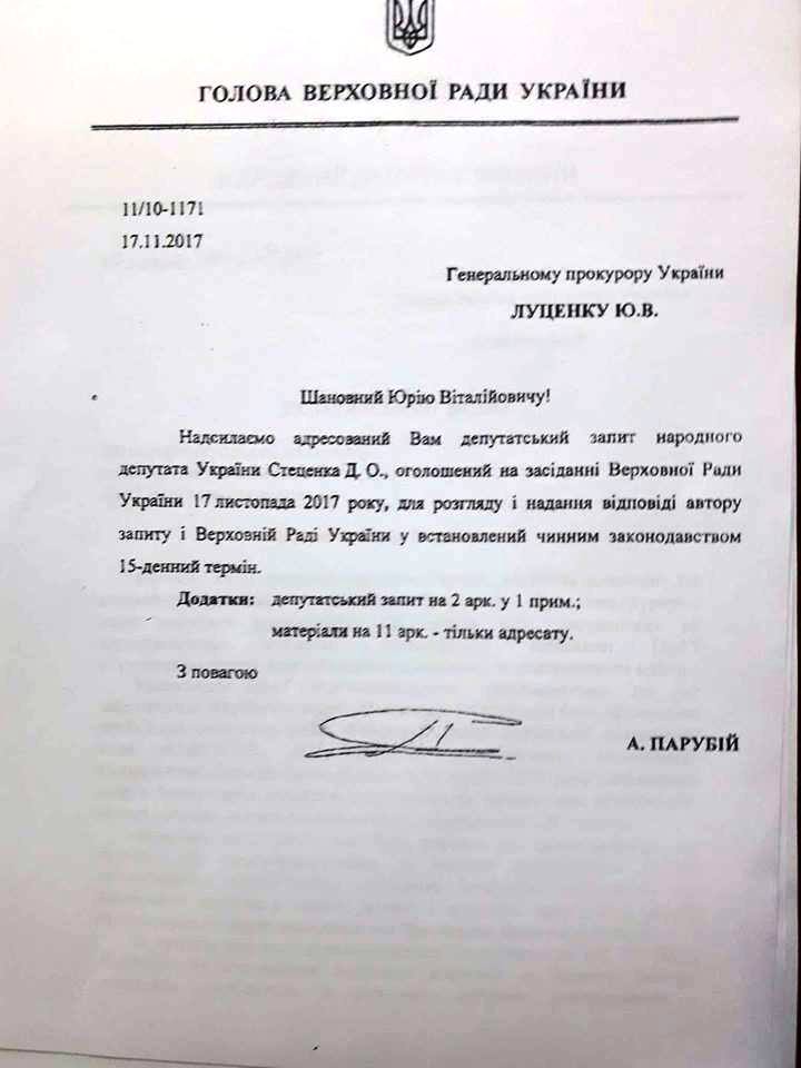 Народний депутат України Дмитро Стеценко (фракція «Народний фронт») подав Генеральному прокурору України Юрієві Луценкові депутатський запит «Щодо перешкоджанню здійсненню господарській діяльності ПрАТ «Трускавецькурорт». У своєму запиті за №37-С від 15 листопада 2017 року депутат Стеценко просить генерального прокурора «розглянути дане питання щодо виявлення причин та умов, що сприяли вчиненню даного правопорушення», чим фактично стає на захист структури ПрАТ «Трускавецькурорт».