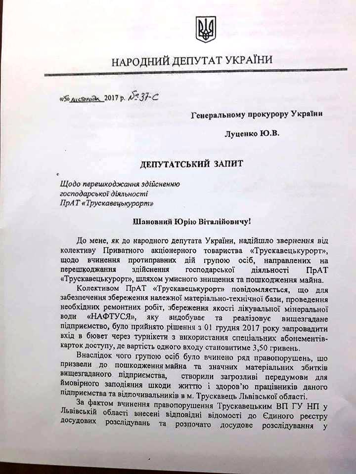 30-річний депутат, обраний за списком «Народного фронту», оголосив свій запит на засіданні ВРУ 17.11.2017 р. У ньому він вказує, що до нього звернувся колектив ПрАТ «Трускавецькурорт» щодо вчинення групою осіб протиправних дій, спрямованих на перешкоджання здійснення господарській діяльності ПрАТу шляхом умисного знищення та пошкодження майна.