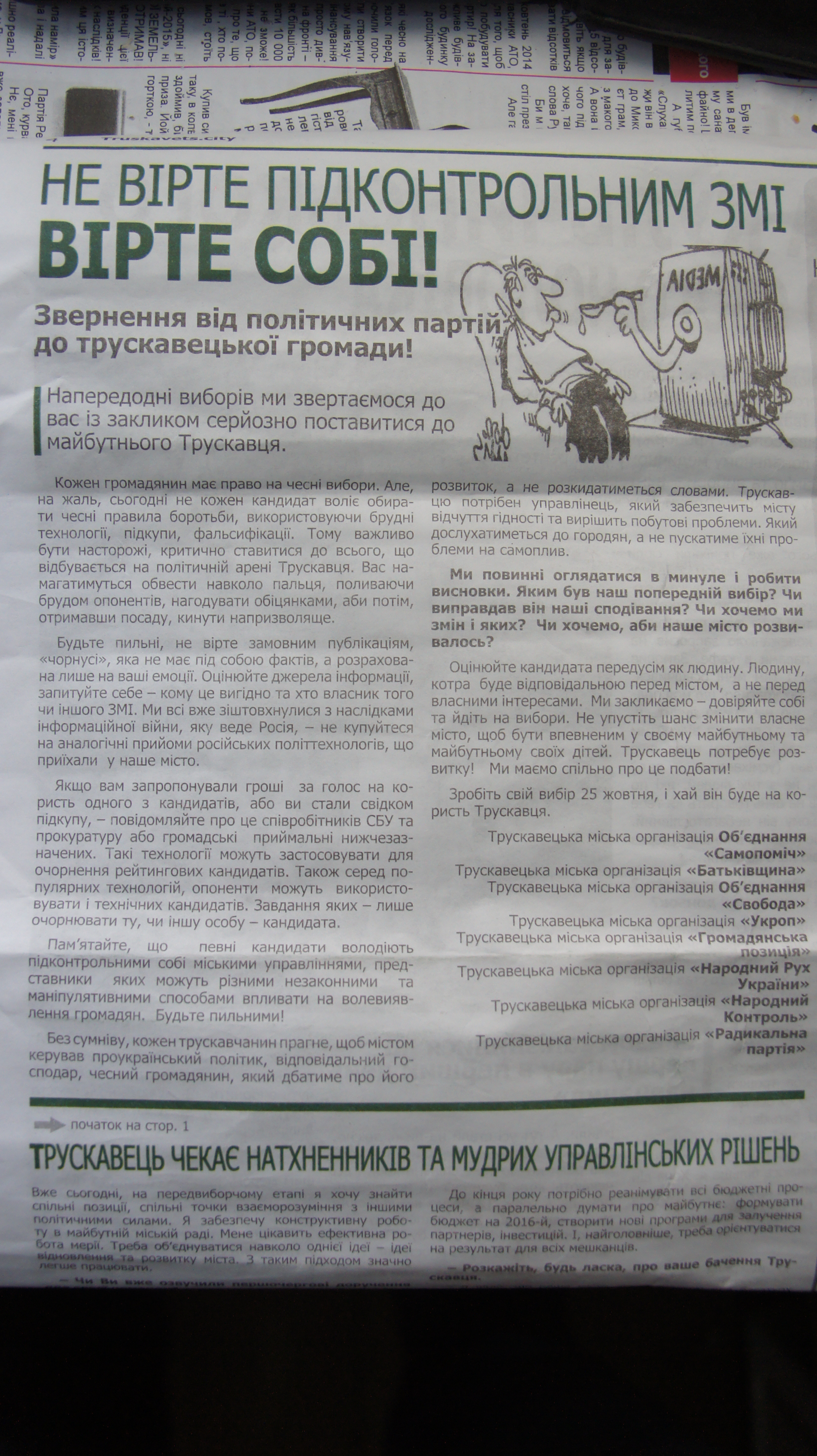 На останній сторінці газети красується матеріал щодо підтримки партійними осередками Трускавця ініціатив Андрія Кульчинського та свідомого голосування під назвою “Не вірте підконтрольним ЗМІ. Вірте собі”. Під цим матеріалом перечислені партії міста, які сьогодні балотуються до міської ради в якості таких, що підписали та підтримали цю ініціативу. Серед них “Самопоміч”, Громадський Рух “Народний контроль”, “Громадянська позиція” “Свобода”, “Укроп”, “Народний рух України”, “Радикальна партія”. Парадокс ситуації в тому, що деякі із вищезгаданих партосередків міста такої заяви не підписували та згоди на цю публікацію не дававли.