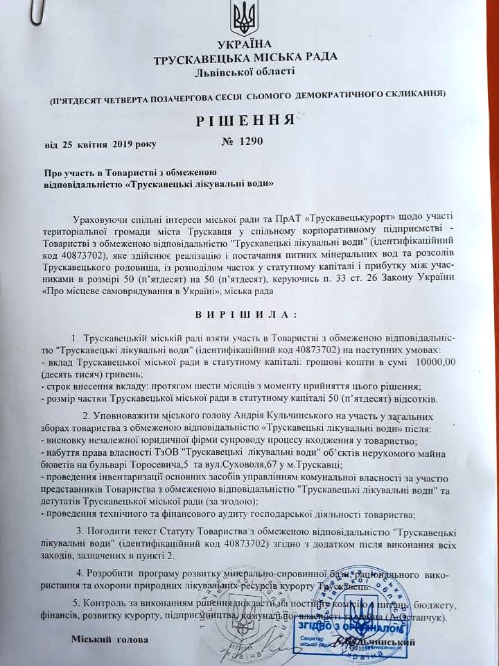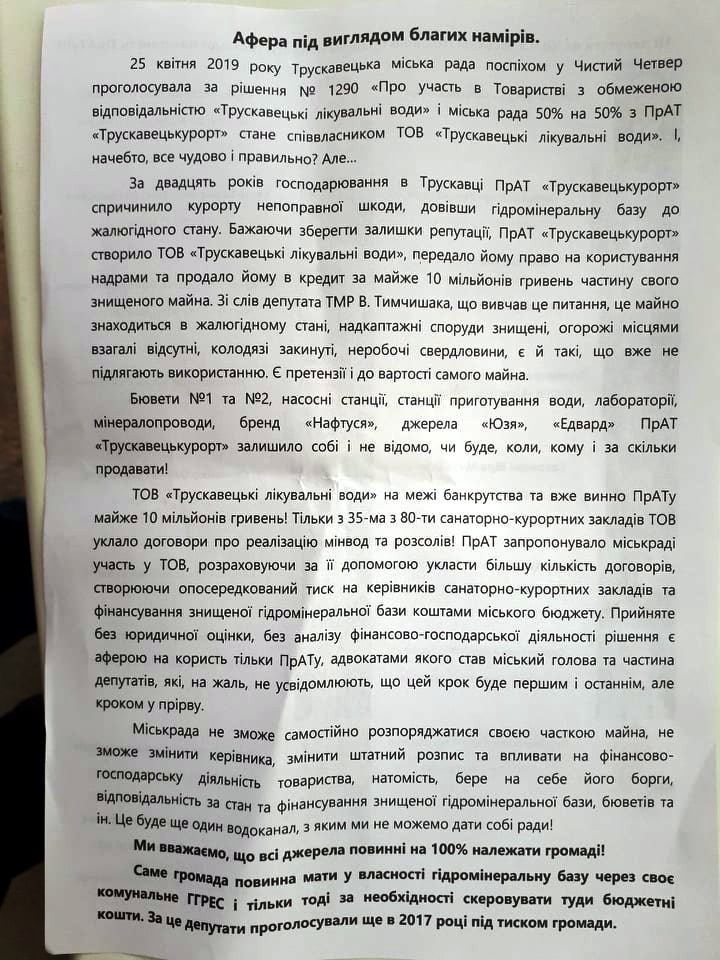 У Трускавці невідомі масово розповсюджують анонімні листівки, в яких критиці піддаються міський голова Андрій Кульчинський, заступник міського голови Олексій Балицький та 15 депутатів Трускавецької міської ради, котрі 25 квітня проголосували за рішення про входження в ТОВ «Трускавецькі лікувальні води».