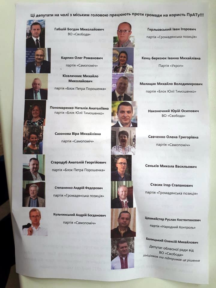 Поряд з роз`яснювальним текстом розповсюджуються також зображення тих депутатів, котрі голосували за сумнівне рішення проти інтересів громади. Біля зображень вказано прізвища депутатів та яку політичну силу вони представляють. Зображення поширюються під назвою «Ці депутати на чолі з міським головою працюють проти громади на користь ПрАТу!».